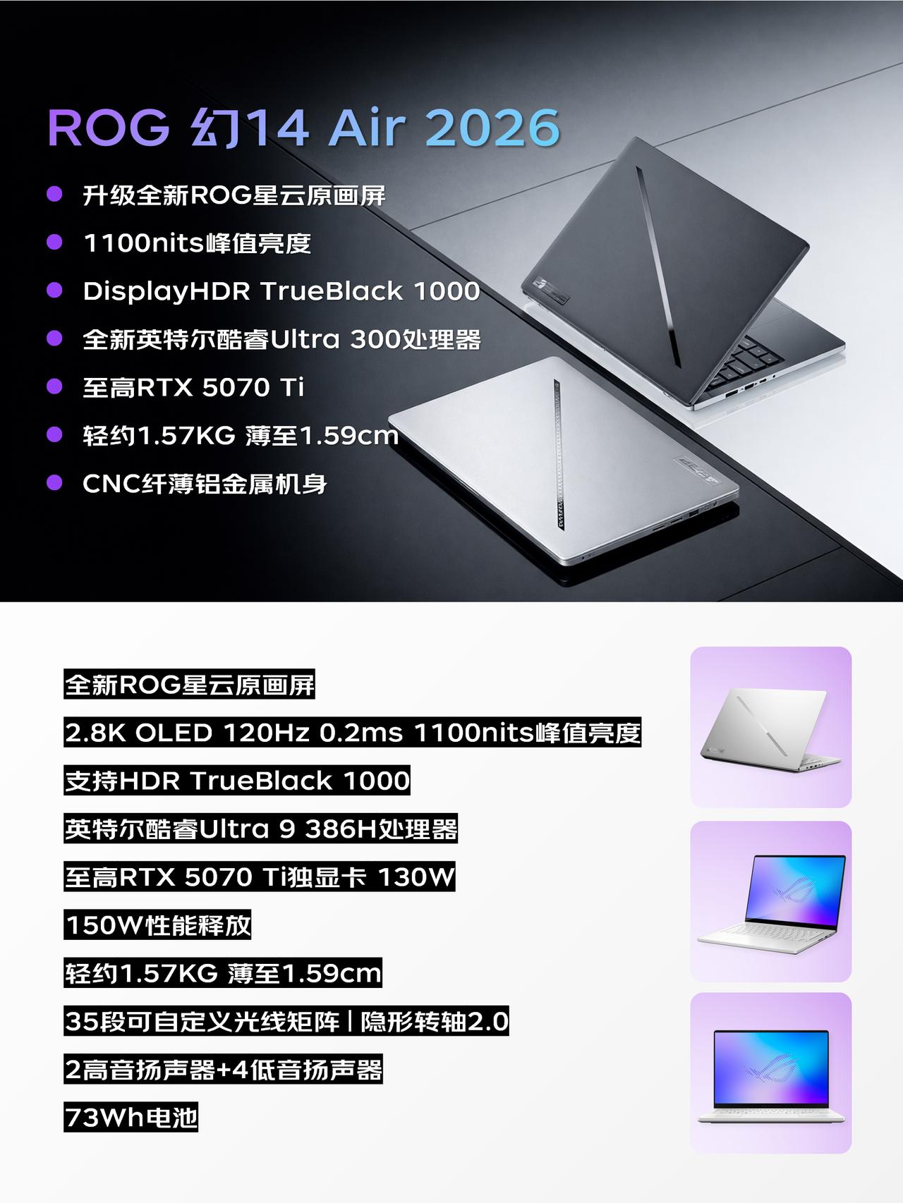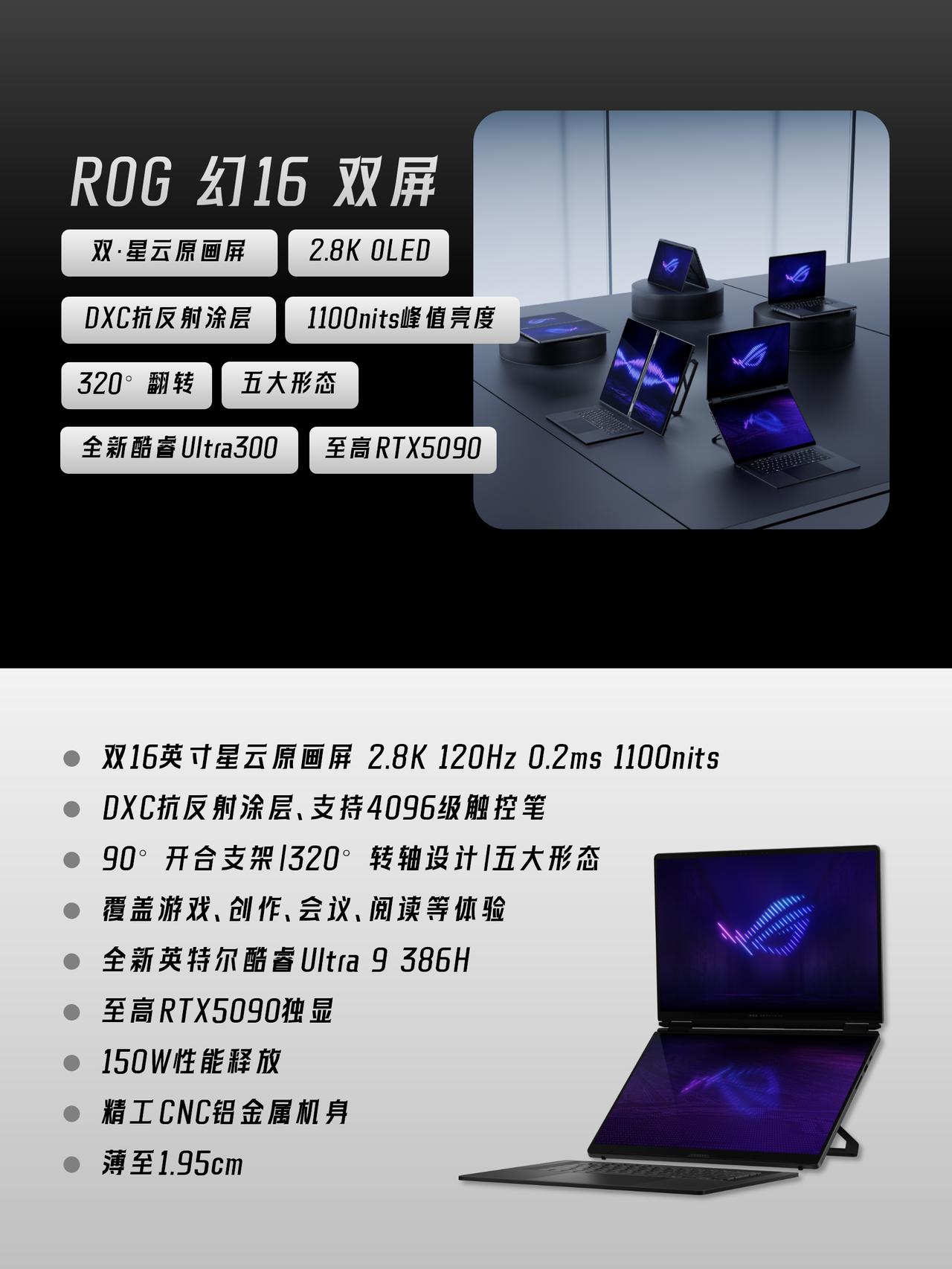 ROG 2026新品速递!三款新本本看完我酸了… 看了ROG CES 2026发布会,新品阵容挺亮眼! 直接甩出三款王炸新品,简单汇总一下它们的升级点👇 1️⃣ ROG 幻16 双屏 双屏设计是最大亮点!直接上了两块16寸星云原画屏,主屏+副屏观感很统一,不像有些品牌拼接感重。而且屏幕展开后视野超大,写代码、剪视频能多线操作,效率拉满。性能也很硬核,酷睿ultra300+RTX5090,感觉是给专业创作者和硬核玩家准备的终极装备🤔 2️⃣ ROG 幻16 Air 幻16 Air升级就很实在!用上了新的ROG星云原画屏,亮度和色彩提升明显,峰值亮度都上到1100nit了,翻倍提升啊。性能更是给得很顶,最高可选RTX 5090独显,还配了新一代酷睿ultra处理器,属于轻薄机身里塞进猛兽性能的代表了,兼顾便携和重度创作+游戏需求。 3️⃣ ROG 幻14 Air 幻14 Air这款更侧重便携,屏幕素质依然是亮点,幻16 Air同款ROG星云原画屏,峰值亮度比前代翻倍提升,而且色彩也饱满,观感应该很出色。同样用上酷睿ultra300系列处理器,最高给到了5070 Ti的独显,且性能释放相比上一代有提升,来到了150W,对于日常办公、轻度创作和网游也够用了,适合注重屏幕素质和携带体验的打工人。 整体看下来,感觉ROG今年思路很清晰:双屏做专业生产力,幻16 Air做全能旗舰,幻14 Air做轻薄担当,你更种草哪款?评论区一起聊聊👇 CES 2026双屏旗舰全能本ROG幻16双屏ROG幻14Air 2026ROG幻16Air 2026