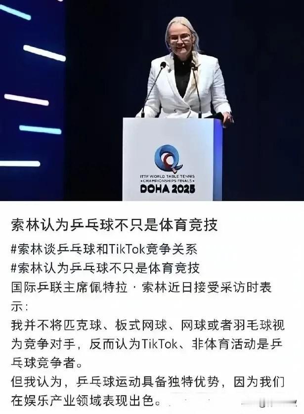 多哈冠军赛,为何让乒坛第一美女金娜英开赛? 以前都是让孙颖莎开赛, 这次孙颖莎不在, 也得顺延至王曼昱或者林诗栋开赛才行。 为何选择金娜英呢? 因为漂亮! 索林早就说了, 她要把乒乓球往娱乐化走, 你把wtt比赛都综艺看就对了! 看打球,看球技, 还得看德甲!