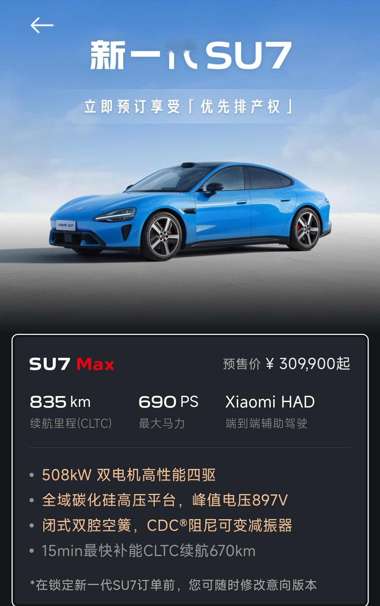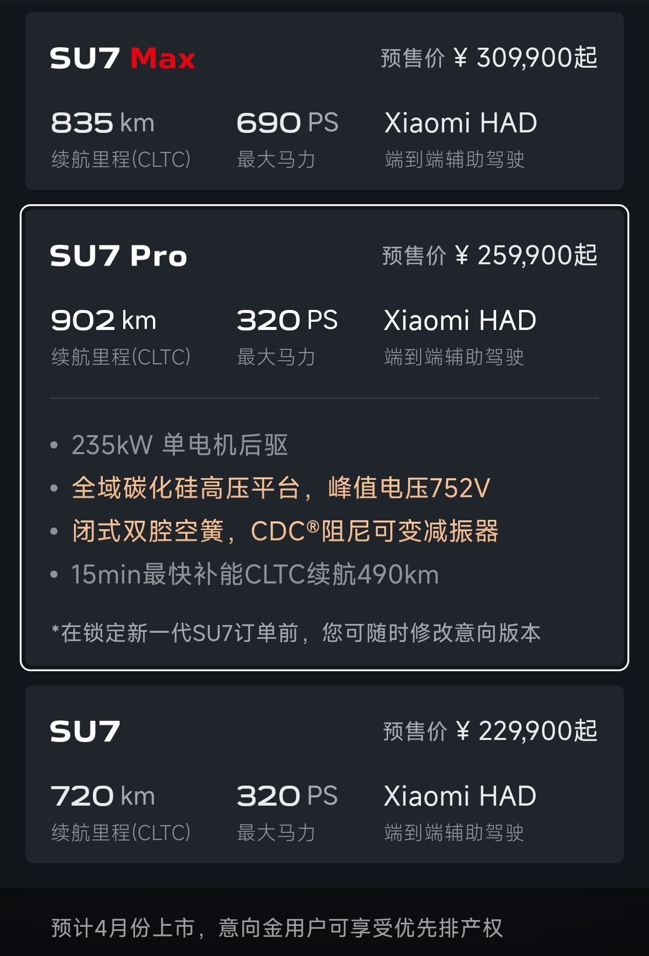 新一代SU7价格四月份才上市现在就开始预售了,小米新SU7预售价22.99万起,全系标配了激光雷达和升级大电池,Pro版本能有九百多公里的续航,等正式上市价格再一降,又又又要真香了
