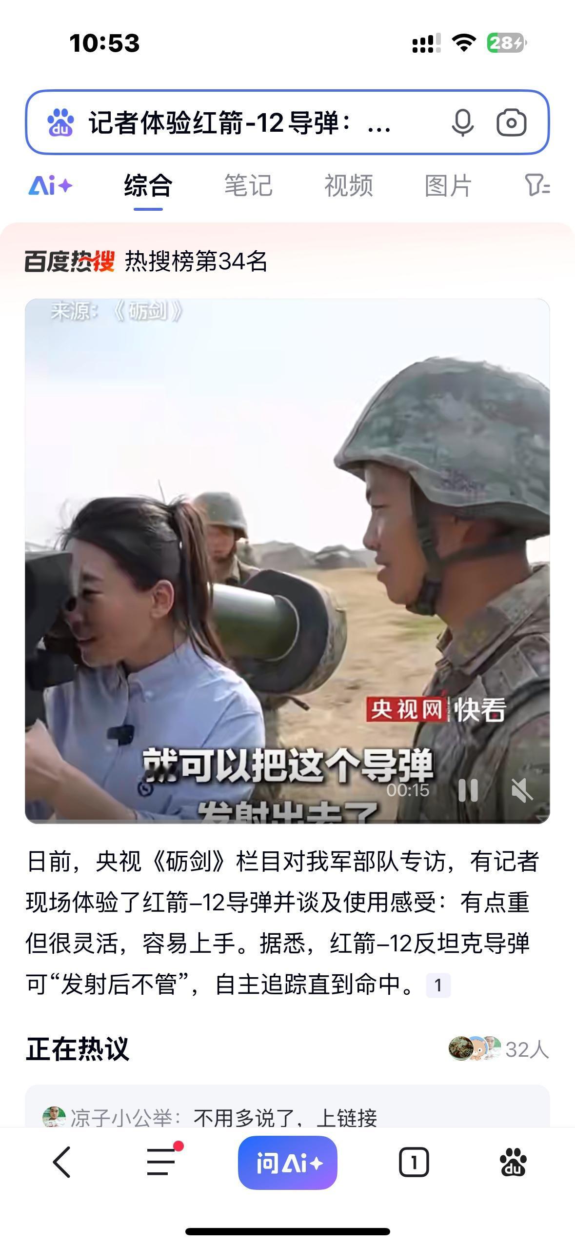 央视《砺剑》栏目专访我军部队时,记者现场体验红箭-12反坦克导弹并分享使用感受:虽略显厚重但操作灵活,上手难度低。据悉,该导弹具备“发射后不管”核心能力,可自主追踪目标直至精准命中。