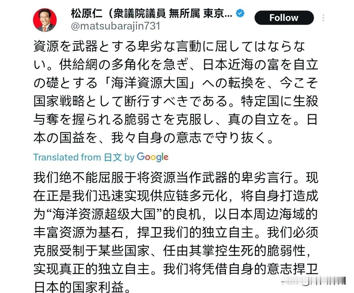 日本众议员松原仁感到非常的跳脚!1月7日,松原仁表示,我们绝不能向将资源当作武器的“卑劣行径”低头。日本必须加快供应链多元化进程,当下更应将依托日本近海资源、转型为以自立为基石的“海洋资源大国”定为国家战略并果断推进。要克服被特定国家掌控生死的脆弱性,实现真正的自立。我们将以自身的意志,誓死捍卫日本的国家利益。 评几句: 日本议员松原仁近日的表态,将资源议题与国家自立绑定,传递出日本在供应链布局层面的考量。其提出的“海洋资源大国”战略,着眼于依托近海资源实现发展转型,背后是对供应链安全的重视。 从现实条件来看,日本近海可开发的海洋资源,在品类和规模上都存在明显局限。据日本水产厅2024年发布的渔业白皮书显示,日本近海渔业资源年捕捞总量约420万吨,仅能满足国内市场需求的60%左右;而近海矿产资源的勘探与开发,还面临技术门槛高、开发成本大等现实难题,绝非一朝一夕就能支撑起国家战略级的需求。 全球经济早已深度互联,供应链的形成是长期市场选择的结果。在这样的背景下,一味强调“去依赖”,反而可能让自身陷入产业链断裂、成本高企的困境。真正的国家自立,从来不是闭门造车的割裂,而是在开放合作中筑牢自身的竞争优势。 值得注意的是,各国资源合作的核心是互利共赢,抛开这一前提谈“捍卫利益”,最终只会偏离发展的正轨。以中日在稀土加工、渔业养殖等领域的合作实绩来看,双方优势互补之下,既保障了日本相关产业的稳定运转,也推动了中国技术与产能的输出,这样的合作模式,才是化解供应链焦虑的最优解。