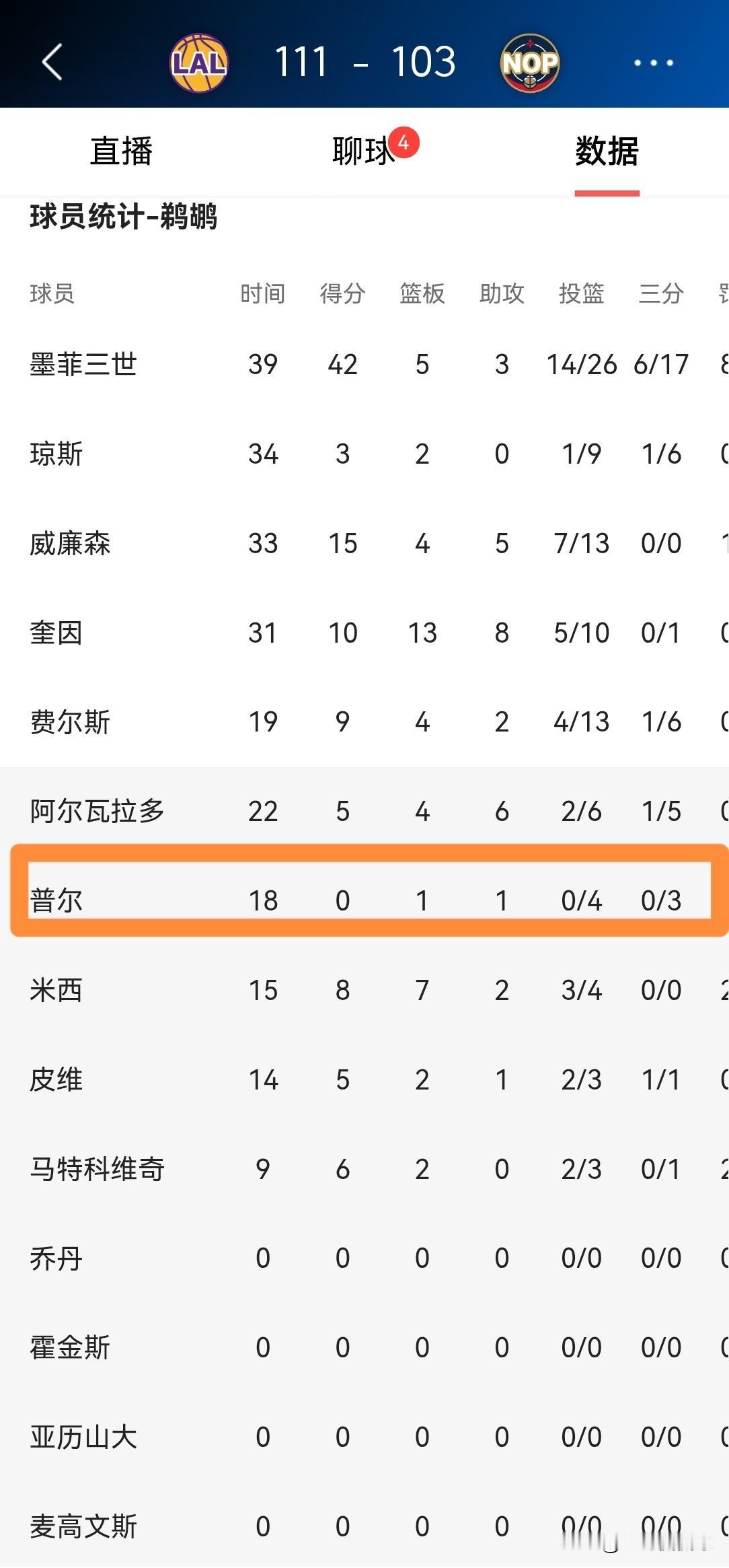 我强烈建议鹈鹕立刻交易乔丹-普尔!在今天鹈鹕主场以103:111输给湖人的比赛中,普尔在攻防两端都打出了极其糟糕的表现,他对球队完全是负作用。 整场比赛下来,普尔替补出战18分钟,投篮4中0,其中三分球3中0怒砍0分,还出现了3次失误,他的场上正负值为-8。 自从普尔离开勇士之后,他直接从一名全明星级别的球员沦落为了一名角色球员,不得不说普尔真是太不争气了。
