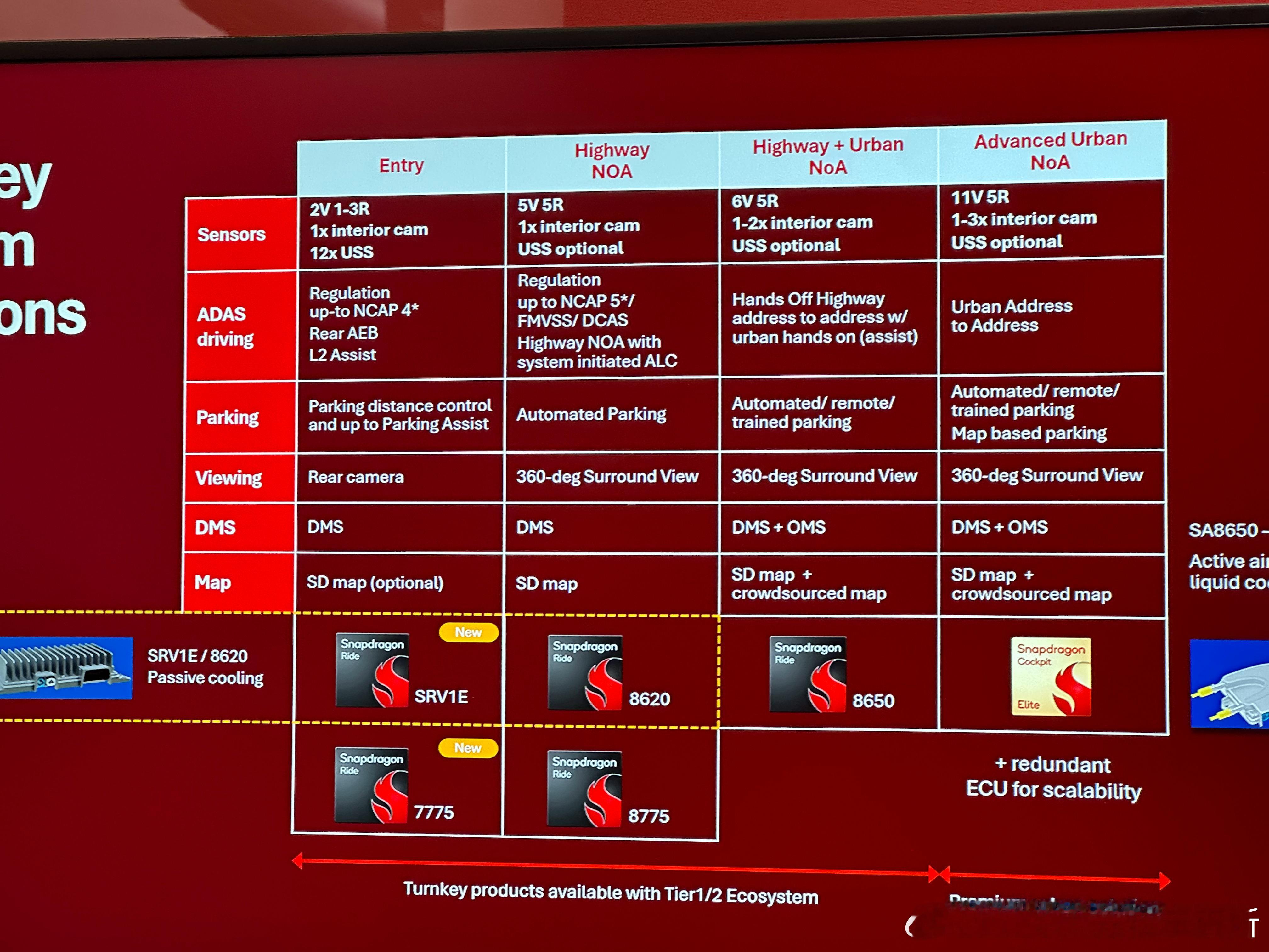 高通的自研辅助驾驶Snapdragon Ride Pilot路线路:- 入门级,2V 1-3R;- 高速NOA,基于8620或者8775+,配合5V5R;- 城市NOA,基于8650+ 6V5R;- 城市NOA进阶,基于8797。高通跟宝马合作的就是这个,参考方案 + 联合开发,不过宝马比较特别,是8650,做高速NOA和城区辅助。自动驾驶ces2026