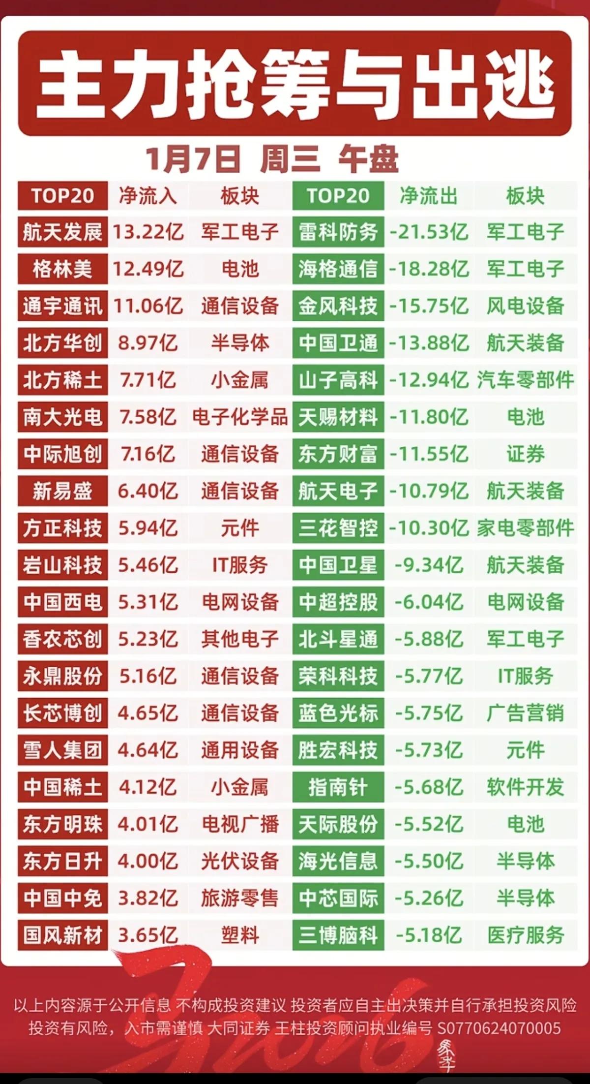 1月7日,周三A股主力资金抢筹出逃一览表!!! 航天发展主力资金大幅流入13.22亿,后市值得高看一眼;格林美主力资金大幅抢筹12.49亿,后市值得期待;雷科防务主力资金大幅流出21.53亿,后市需小心谨慎;海格通信主力资金大幅出逃18.28亿,后市需注意风险!!!