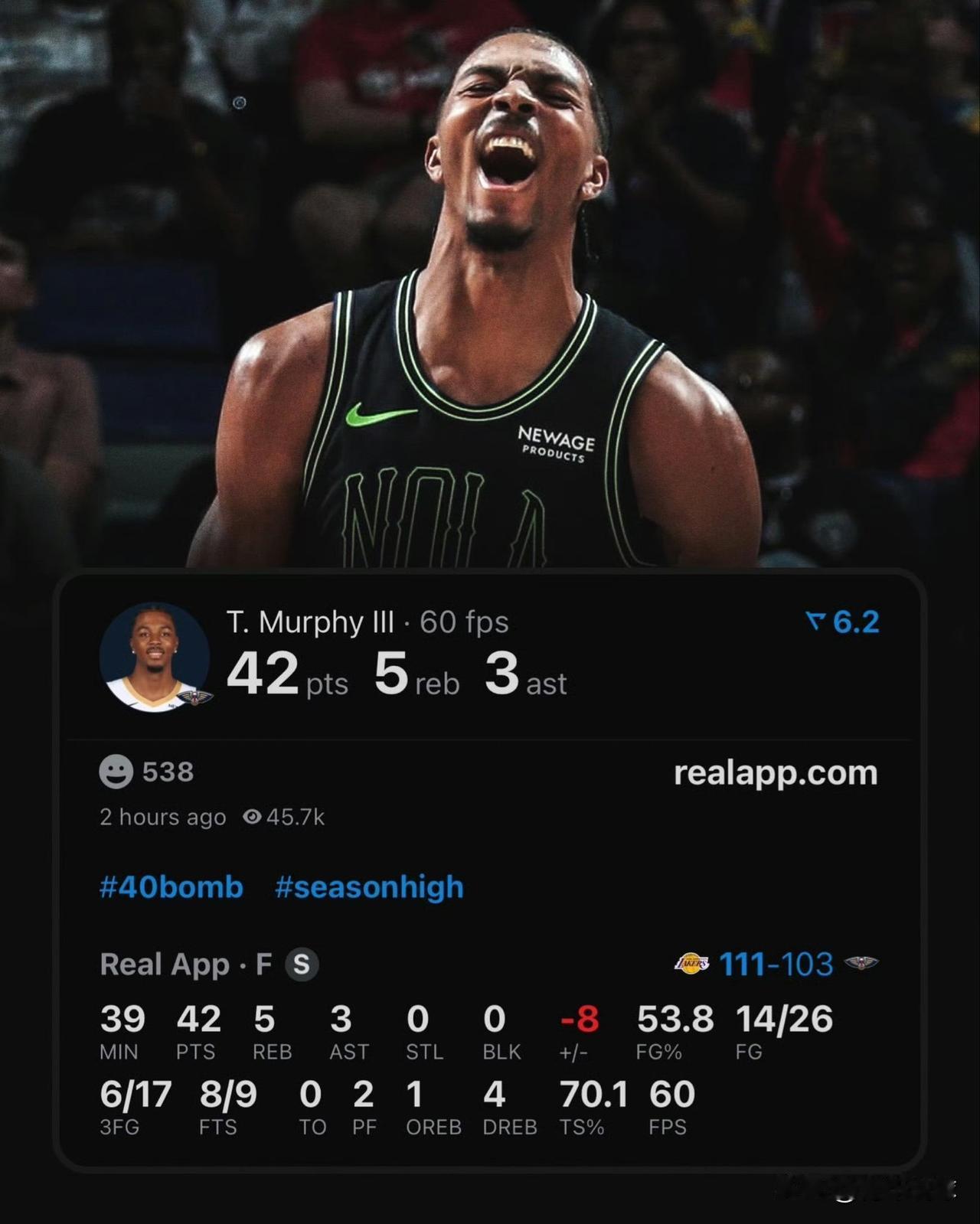 两个首轮哪贵了! 今天鹈鹕与湖人的比赛,墨菲三世险些凭借一己之力带队赢球,怎奈双拳难敌四手,对方有詹姆斯和东契奇两大超级巨星坐镇,鹈鹕队最终在末节崩盘,以103-111不敌对手,遭遇8连败。 本场比赛,墨菲三世狂轰42分5篮板3助攻,其中第三节单节得到17分,得分爆发力惊人。赛季至今,他场均可以得到21.3分6.1篮板3.5助攻1.5抢断,投篮命中率为49.5%,三分球命中率为38.2%,罚球命中率高达91%,进攻效率出色。 墨菲三世与琼斯都是交易市场的香饽饽,鹈鹕队对两人的要价都是是两个无保护首轮签。琼斯暂且不谈,单论墨菲三世本赛季的出色表现,完全配得上两个首轮签吧。