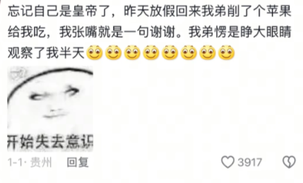 忘记自己是皇帝了,昨天放假回来我弟削了个苹果给我吃,我张嘴就是一句谢谢。我弟愣是睁大眼睛观察了我半天