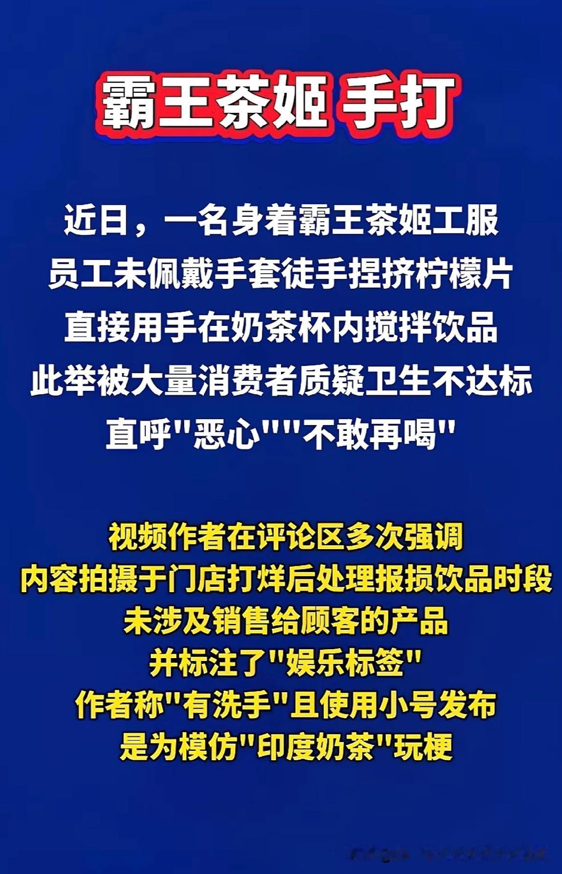 霸王茶姬员工徒手捏柠檬这个事情, 虽然非常有可能是玩梗, 在模仿印度奶茶纯徒手操作的梗, 可是这确实会让广大的消费者很反感。 也有网友表示很多流行饮料品牌都拍了这种玩梗视频, 只能说这些流行饮料品牌的员工是不是傻了, 这就好比你明明是新鲜现炒的餐厅, 非要玩梗搞你这个是预制菜加热, 那谁还来你这里消费, 谁又知道你99次都是符合卫生条件的, 第100次会不会有什么问题。