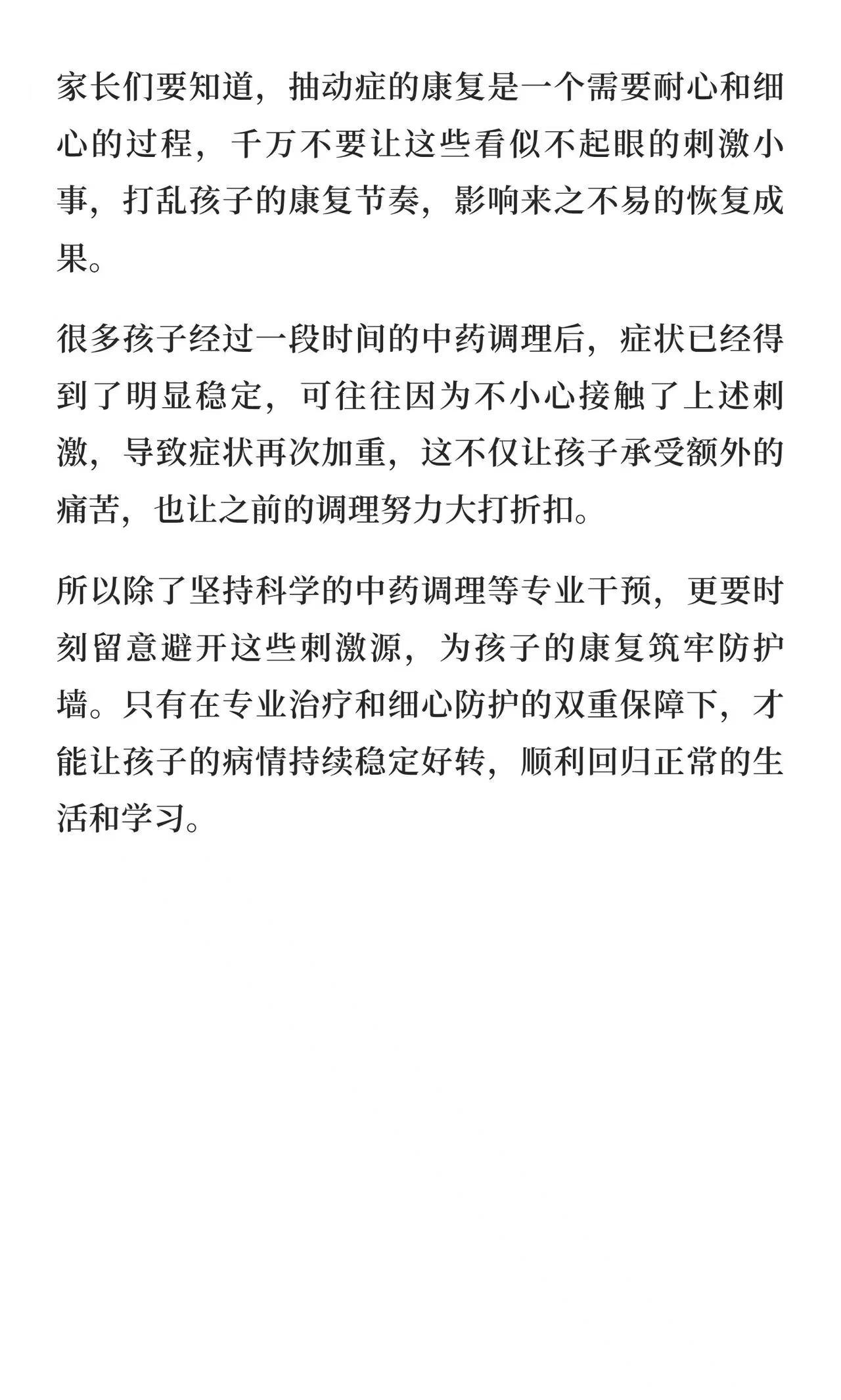 抽动症孩子 不能受这5个刺激 悄悄加重病情,纯属帮倒忙! 一、观看恐怖片 二、参与刺激的游乐项目 三、沉迷激烈的电子游戏 四、家人的争吵 五、鸡肉羊肉辣椒等发物刺激