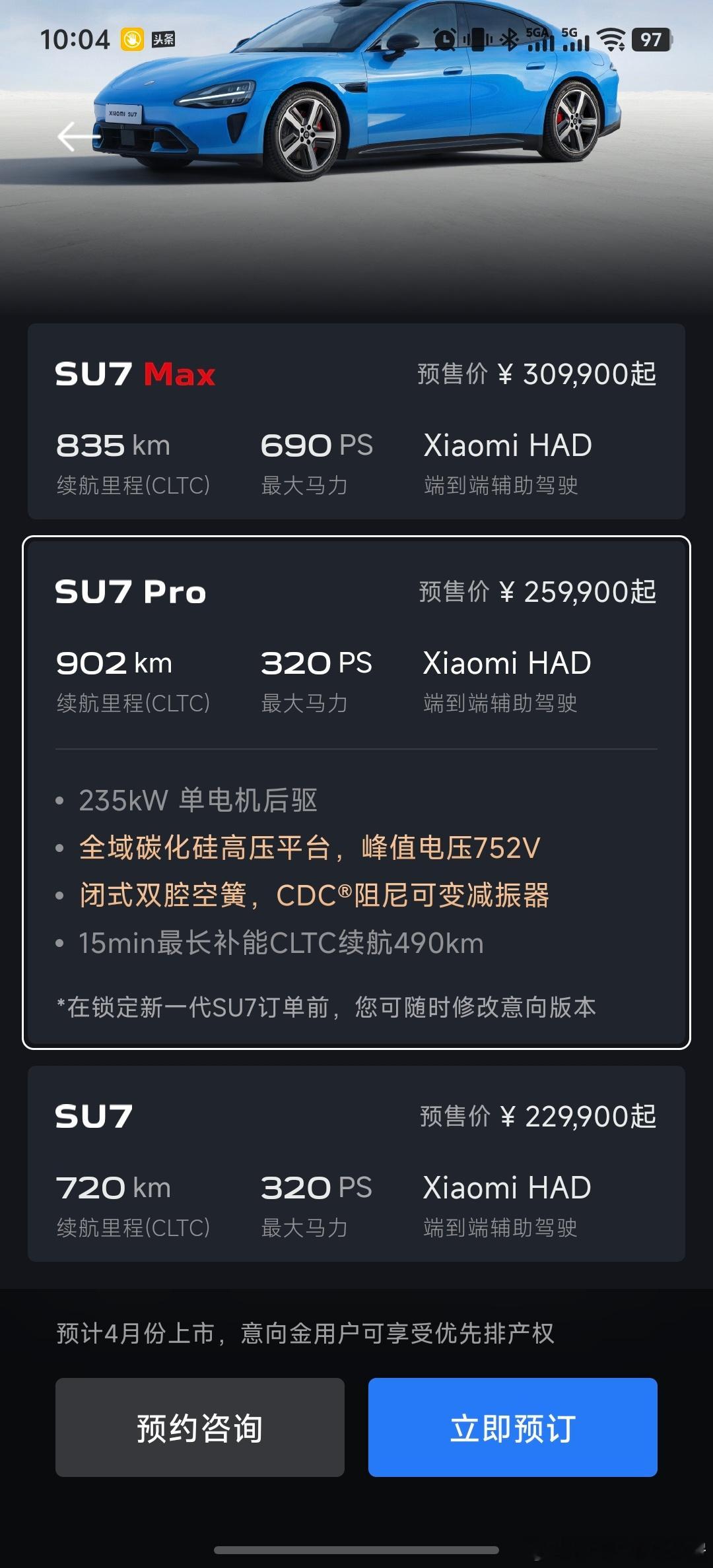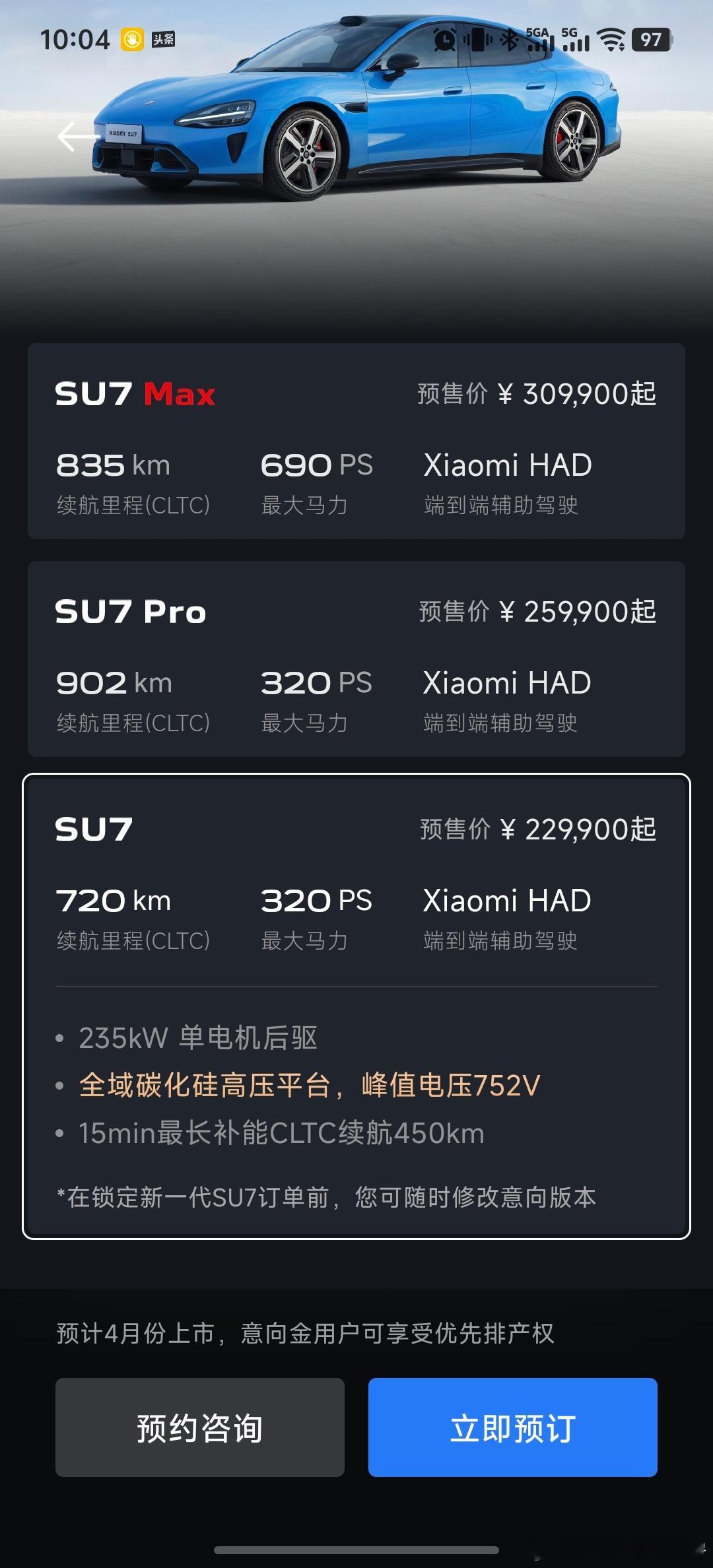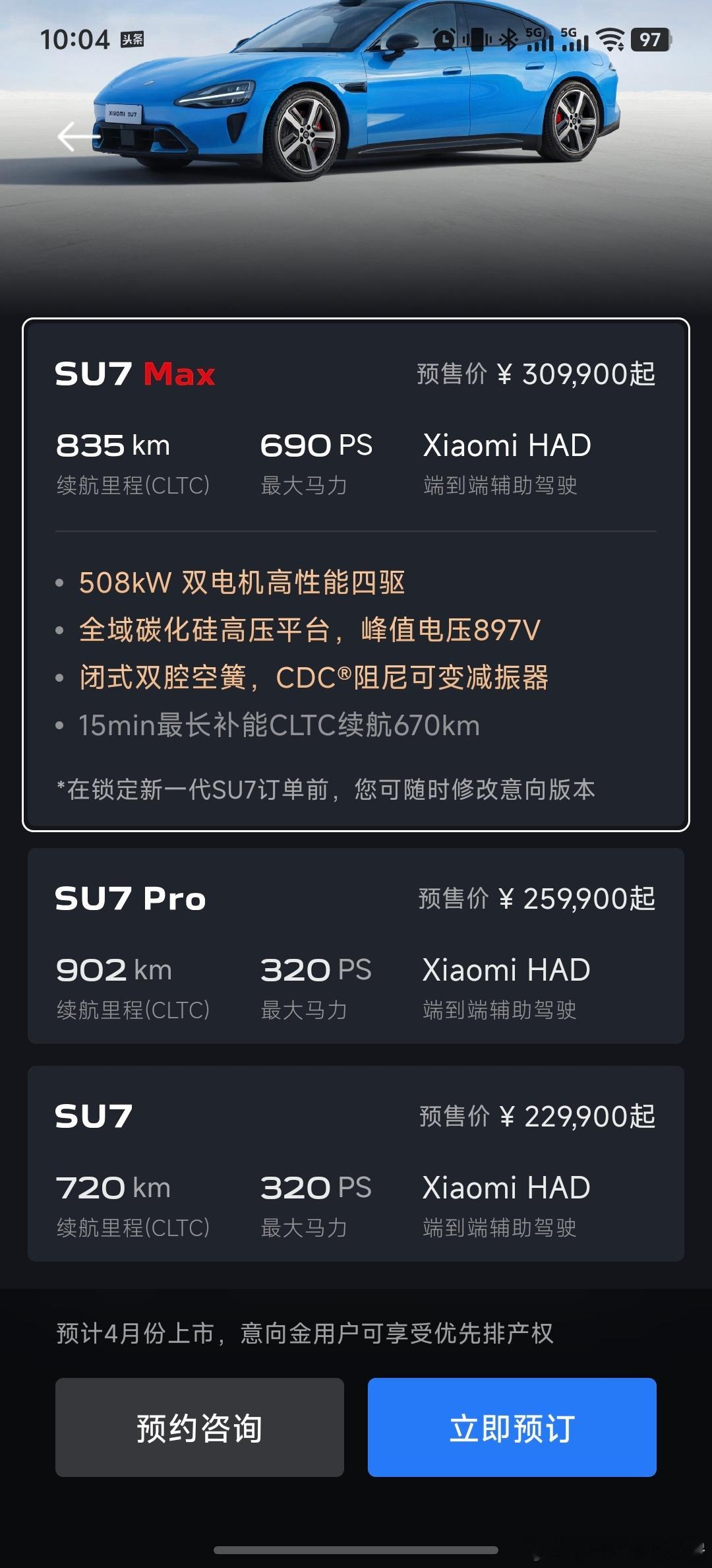 雷军官宣新一代su7 进app看了一下,有依旧3个版本,我觉得长续航版比较适合我。其实现在的新能源车的配置基本拉满了。倨能聊 新一代SU7价格
