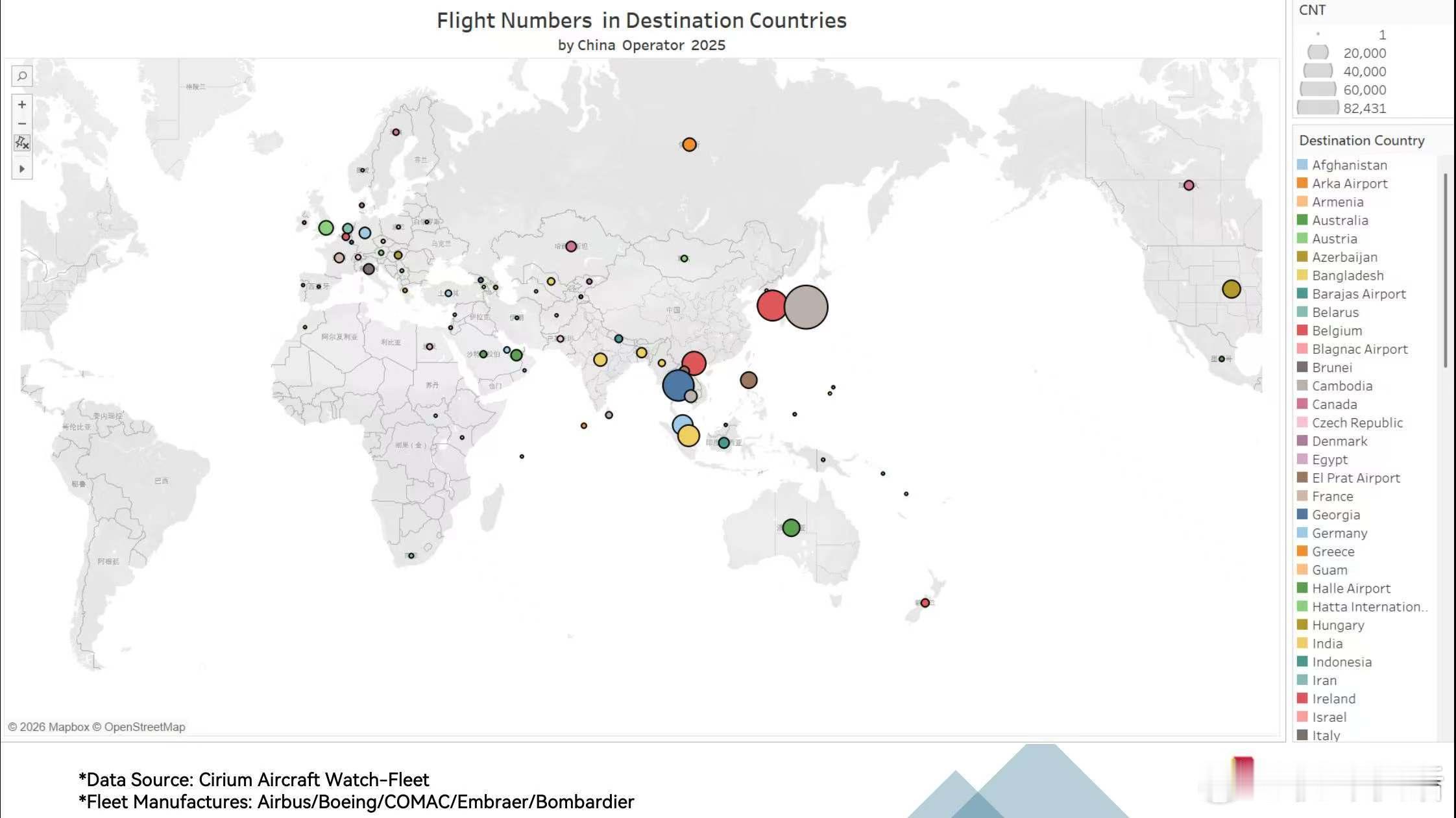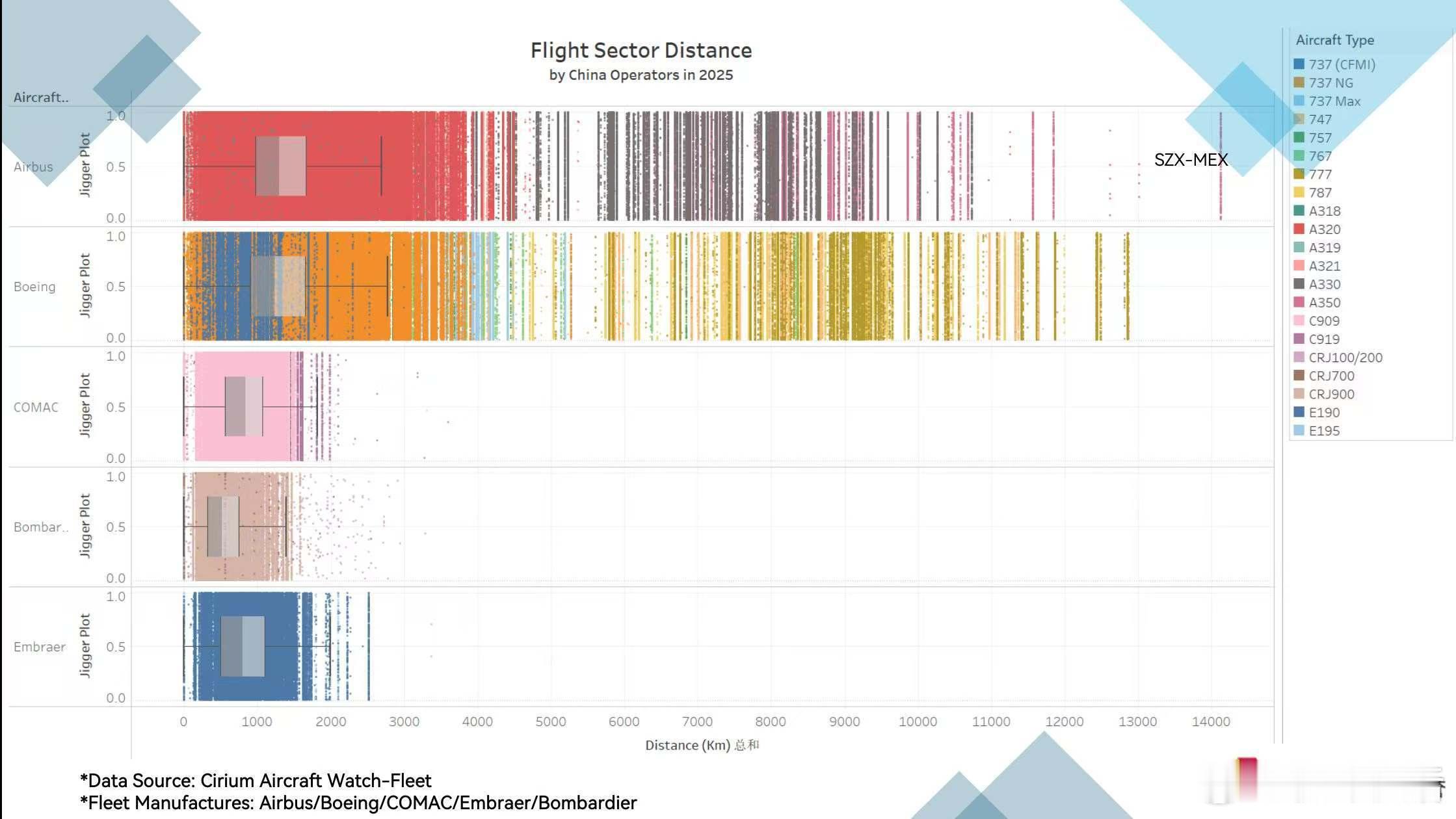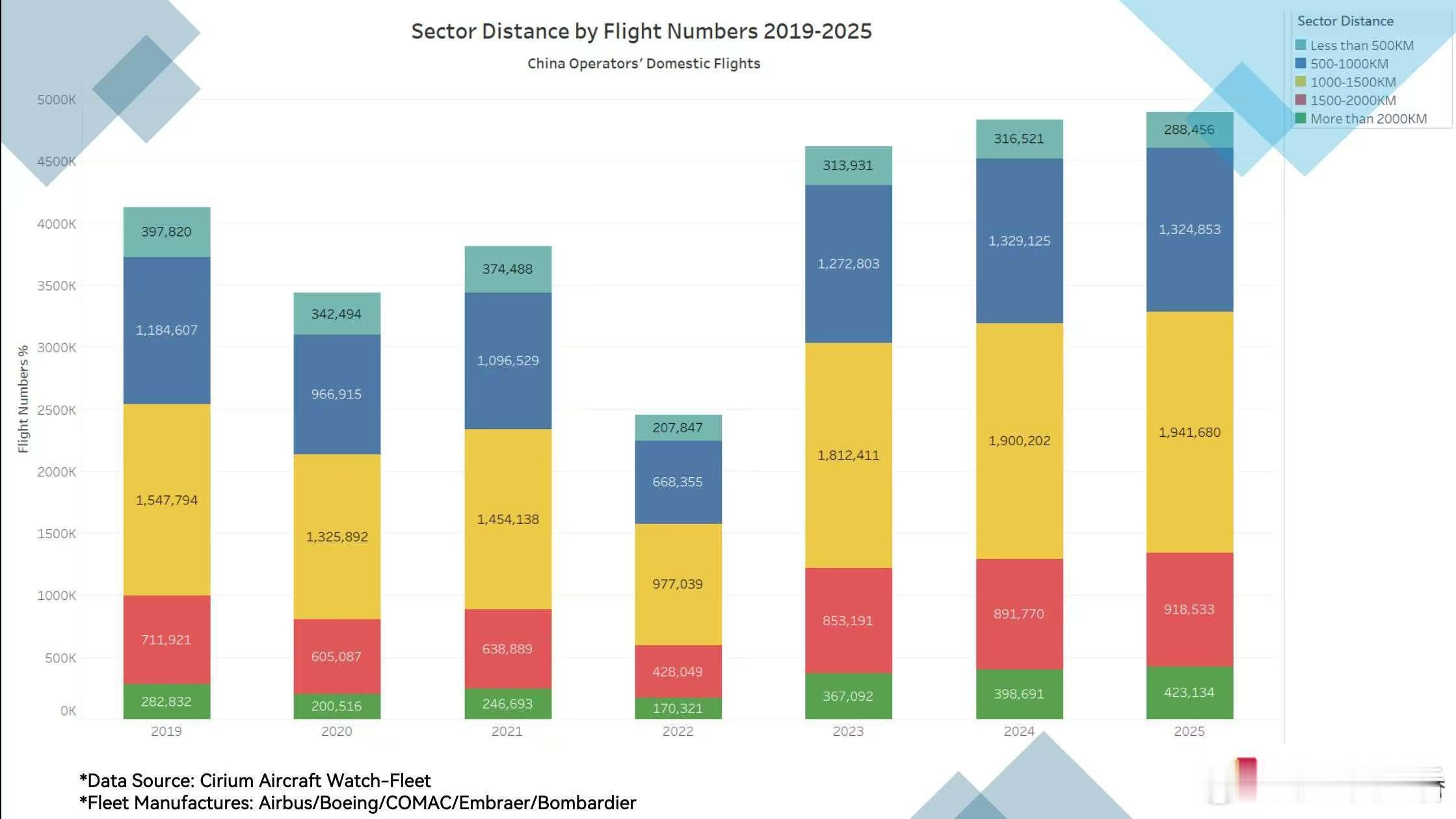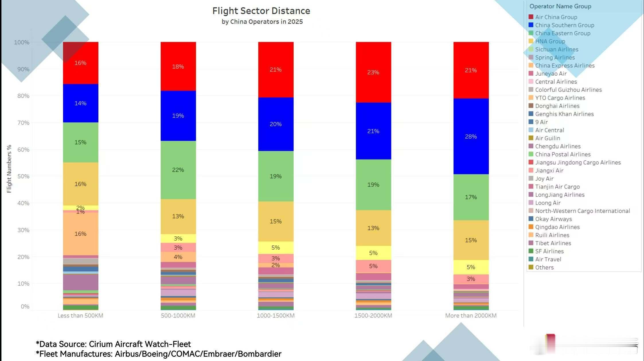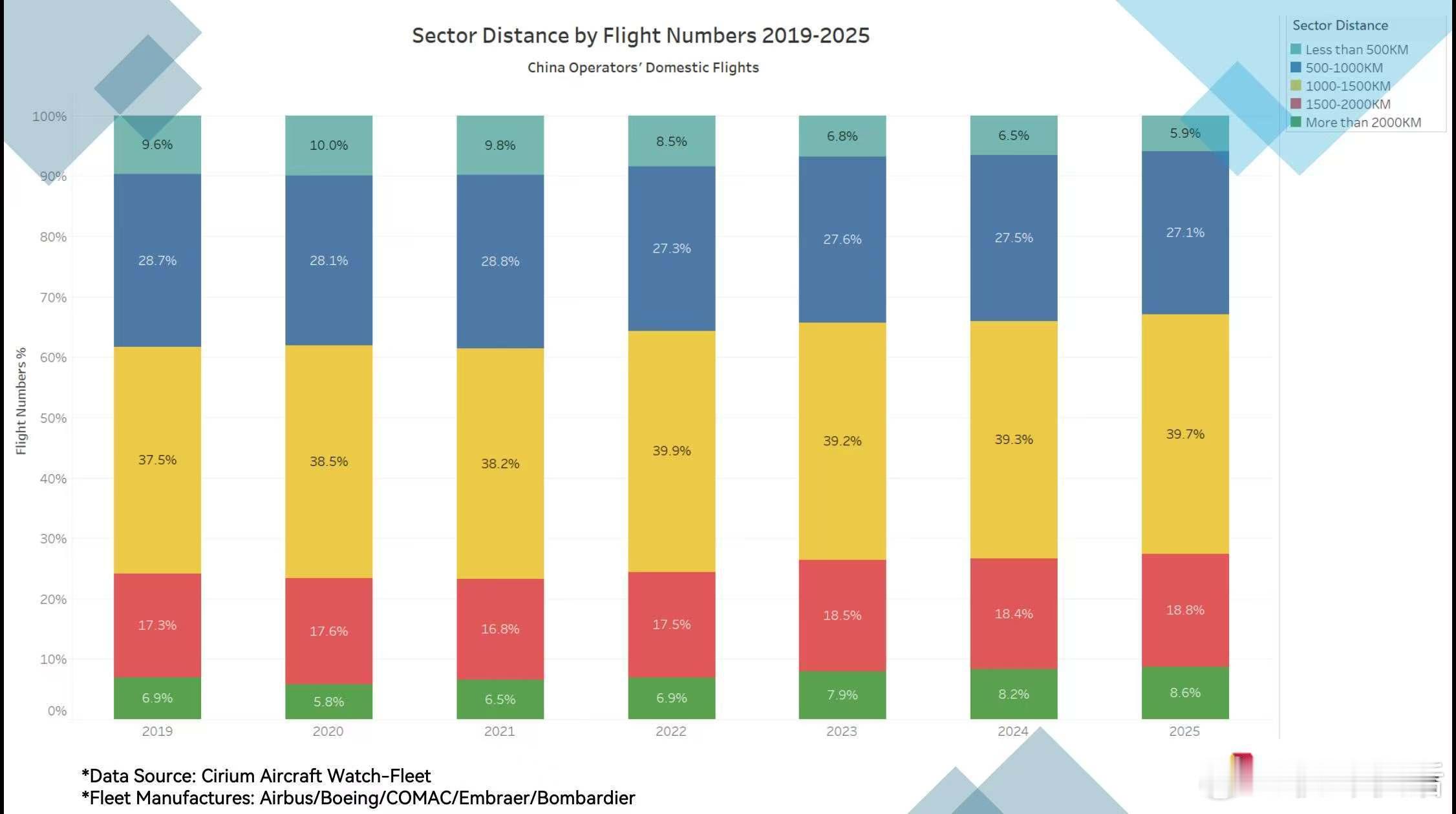 2025年中国区航班运行数据趋势总结短途航段(<500公里)持续萎缩该航段航班数量及占比进一步下跌,2025年占比降至5.9%,较2019年航班量减少27.5%。航司份额方面,国航、海航、华夏航空占比均在16% 左右,南航、东航分别为14%、15%;机型占比上,商飞、庞巴迪、巴航分别为11%、12%、8%。短途出行需求被高铁、自驾进一步分流。中短途航段(500-1000公里)增长乏力该航段2025年航班量与2024年几乎持平,较2019年仅增长11.8%,增长动力不足。中长途及长途航段(≥1000公里)成增长主力1000-1500公里为国内航班最集中区间,国内占比39.6%,含国际航班占比37.1%,较2019年增幅25.4%;1500-2000公里航段较2019年增幅29%;2000公里以上航段增幅最高,达49.6%;航司拉长平均航段距离的趋势十分清晰。高铁提速将冲击长途出行需求CR450试验速度达450公里/小时,商业运营时速将达400公里/小时,叠加西十高铁等新线路开通,高铁对1000公里以上出行需求的分流效应预计进一步提升。