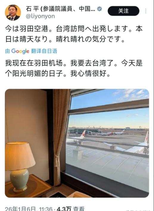 被我方制裁的大汉奸、日本参议员石平(1月6日)写道:“我现在在羽田机场。我要去台湾了。今天是个阳光明媚的日子。我心情很好。”今天抵达台北松山机场后,石平再次发表挑衅言论。 石平这个名字,这些年在中国人眼中早就不是普通两个字,这个原本出生在中国、在北大读书、后来跑到日本入了籍的人,如今摇身一变成了日本参议员,开口闭口就是在中国人脸上扎针的言论。 1月6日,他高调在社交媒体上晒出自己“要去台湾了”,一副得意洋洋、志得意满的样子,到了台北还能继续放狠话,说出一些完全不顾事实、不顾国际共识的分裂言论,不仅挑衅意味十足,更让人对他的底线感到惊讶:你可以有立场,但不能连基本的历史和现实都不认了。 这不是他第一次出格,也不会是他最后一次,但这次的时机和动作实在太扎眼,在行动之前他就在社交平台上放出消息,我们外交部发言人也给出了警告,谁知道他还是死性不改。 当下刚刚过去的环台军演还没多久,局势刚刚稍微平稳下来,他就挑这个档口窜过去,怎么看都不像是“自由旅行”,更像是一场有备而来的政治投机,他很清楚,自己要的不是跟谁沟通,而是故意制造冲突,往台海这盆火里添点油。 在岛内的“台独”分子看来,像石平这种人,是他们的“外援”,嘴上说着支持,实际上是来给他们“撑场子”的,但真想想,台湾老百姓可能更清楚:一个能背弃自己出生地、否认自己文化根源的人,嘴里说出来的那点“支持”,有几分是真心?他把台湾当跳板,图的是自己的政治收益,哪管台湾人到底需要什么。 再看他走过的这一路,从北大学哲学,到日本拿国籍,从一个留学生变成右翼议员,他的每一步都在往“反中”这条线上靠。 别人讲逻辑、讲立场,他讲的是表演和投机,他会写书、会上节目、会喊口号,全是围绕一个主题:怎么才能把“反中”的声音喊得更大,让右翼势力更满意。 他的书名直接就是“我为何抛弃了中国”,这不是观点,这是宣誓,他想要通过“背叛”去包装自己,最后成了一种“以恨为荣”的形象。 2025年他当选日本参议员,这让他更有了“表演空间”,参拜靖国神社、否认历史罪行、公开支持“台独”,这些行为本身就已经踩在中国人最不能接受的底线上了。 而他自己,反倒乐在其中,不断用极端言论来博取在日本政坛的存在感,他清楚,自己在日本政界根基不稳,靠正常路线很难出头,所以就干脆走极端路线,靠攻击中国吸引眼球,说白了,就是“表忠心”,用最刺耳的话证明自己不是“外人”。 可问题是,他到底是谁都不信,他在日本本土也一直被人质疑,说他是“混血政客”,说他“没有日本人的忠诚”,甚至有右翼媒体骂他是“从中国跑来的寄生虫”。 他为了洗脱这些指责,只能越来越激进,拿“反中”当武器,想向外界证明他跟中国没有半毛钱关系,到头来,他不是在表达立场,而是在撕掉自己仅剩的一点人格尊严。 这一次窜访台湾,是他长期操作路线的延续,也是他“政治投机”道路上的又一次尝试,他知道,自己在日本不算主流,在台湾也不受欢迎,但只要能在这两个地方之间制造矛盾,他就能在夹缝中活得更久一点。 岛内的“台独”分子也乐意配合他这个“外援”,因为他们也缺国际曝光,但彼此都明白,这种互相利用的关系迟早会翻脸。 中国方面对他的态度很清楚,2025年9月,中国对他进行全面制裁,冻结所有在中国的资产、切断一切经济联系、禁止他及直系亲属入境。 这几条措施看似“没什么”,可对于一个曾在中国成长、生活、学习多年的人来说,基本等于被彻底切断了和故土的所有联系,这不仅是对他个人的惩戒,更是一种信号:你要跳,我们就断;你要闹,我们就封,国家的底线不是谁想碰就能碰的。 而外交部的回应更显出一种冷静的自信,“这种人,不值一评。”短短几个字,既没有被带节奏,也没有被情绪影响,而是以一种大国风范,把他当成“小丑”处理。 不是不重视,而是没必要再跟他争论什么,事实已经摆在那,国际社会早就承认一个中国原则,台湾是中国的一部分,这是根本没得谈的,石平说得再多,也改变不了这一点。 台湾内部其实也不傻,没人真正把他当“朋友”,一个连自己祖国都能抛弃的人,怎么可能真心为别人好?他嘴上说得漂亮,实际是拿台湾做秀场。 他的“访问”,更像是一个临时演员的即兴表演,演完就走,拍完照就飞,他不在乎台湾的安全,也不在乎两岸关系的走向,他只想拿这次“窜访”去换点政治积分,继续在日本政界刷存在感。 而这种行为,在国际上也越来越没市场,你可以有个人观点,但当你开始挑战国际共识、挑动地区矛盾、干扰别国内政的时候,就已经越过底线。 石平也许还沉浸在“我说了什么惊天动地”的幻觉里,但实际上,他的话语早已不再有多少分量,国际社会看的不是谁跳得高,而是谁做得稳,一个靠叫嚣博关注的人,注定成不了长线角色。