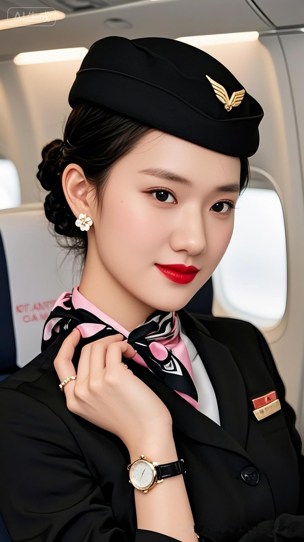 空姐的优雅与美丽:黑帽金徽,红唇白花,尽显职业风采。