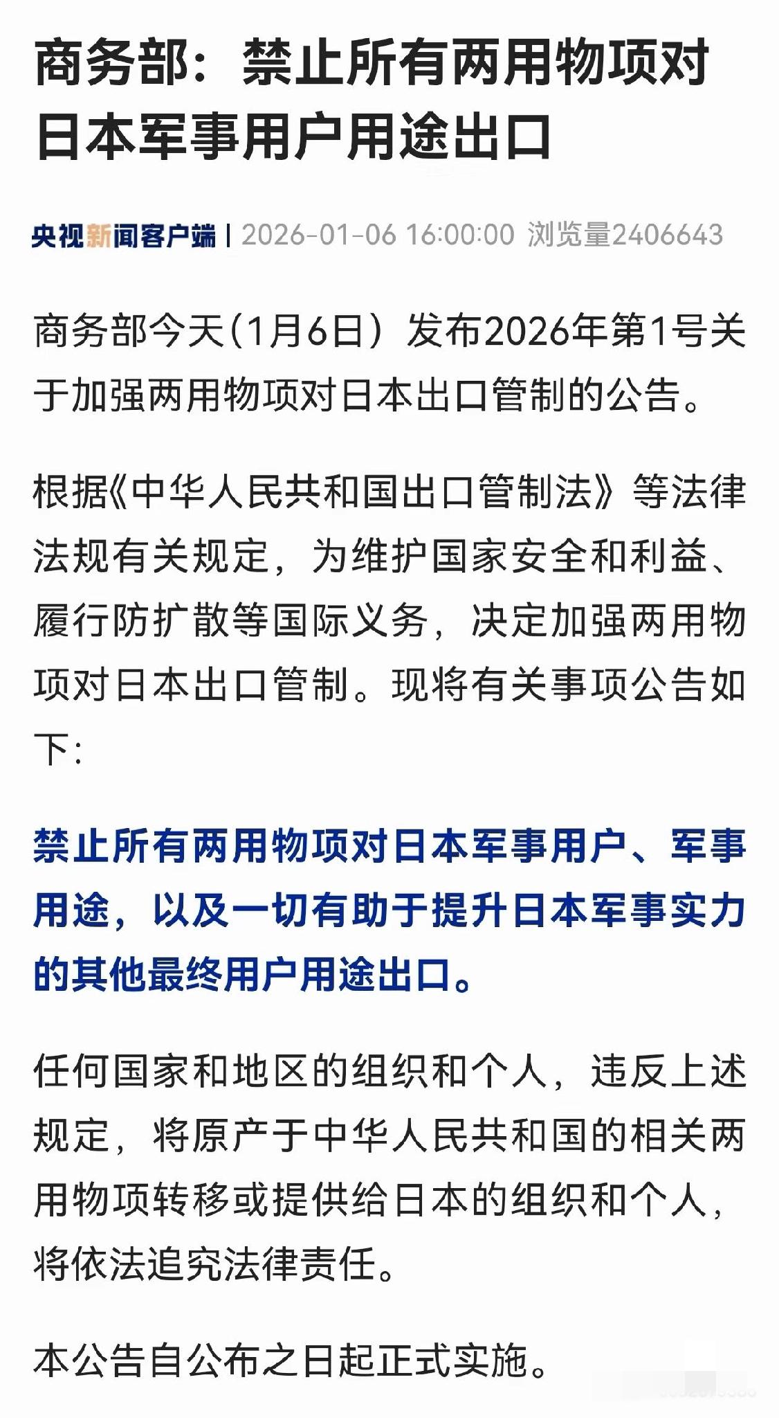 商务部:禁止所有两用物项对日本军事用户、军事用途,以及一切有助于提升日本军事实力的其他最终用户用途出口。 而且,这次禁运里面,其中有一个特别条款,就是穿透性制裁,简单的说,就是所有从中国进口军民两用的国家,如果转口再出口到日本,那么,也将会受到中国的同等禁运(指的就是印度和新加坡)