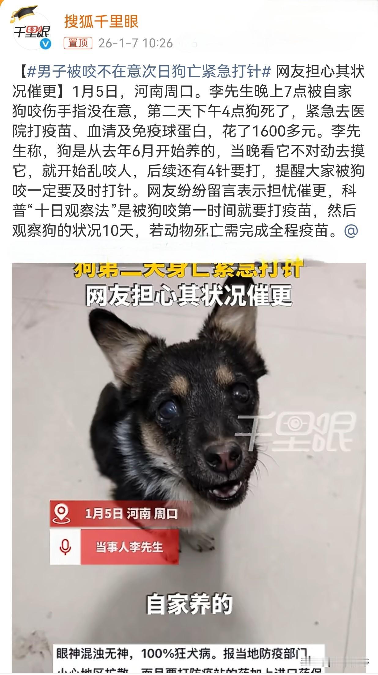 养宠安全保障是第一位的。 这事表面看是侥幸心理害人,觉得自家狗没事,伤口也不深,拖一拖无所谓。但往深了想,其实暴露了我们很多人对狂犬病预防知识的一知半解。大家要注意狂犬病潜伏期多为1-3个月(短则数天),一旦发病死亡率近100%。李先生饲养半年的狗突然狂躁咬人后在21小时内犬只死亡,或有高度狂犬病毒感染风险。如果被犬猫咬后应立即用肥皂水冲洗伤口15分钟,降低90%病毒量,并在24小时内就医。只要在发病前完成规范的疫苗接种和免疫球蛋白注射,就能有效阻断病毒感染。李先生在狗死亡次日就就医,且伤口仅为手指咬伤,未出现严重破溃感染,及时处置的窗口期仍在可控范围内。 此外还有要定期为宠物接种狂犬疫苗,现在市场上的宠用疫苗良莠不齐,给家里小狗小猫打完疫苗一定要测抗体,抗体未生成或载量不够要及时重打!另外狂犬苗由于它本身的特性,不是终身抗体保护,本身也需要定期打加强针!👌 另请养宠人士注意:十日观察法不是说被咬了观察狗十日再处理,而是被咬了就要去打疫苗,再观察狗十日,狗十日不死,后续疫苗可以考虑不打。被咬第一时间就要打疫苗,观察十日只是用来判断后面几针要不要打,(条件允许下应打尽打)别理解错了。疯狗狂犬病 狂犬病自查