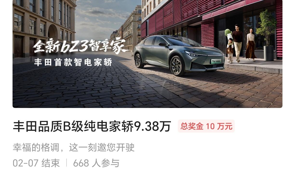 新年的第一个汽车征文来了,丰田bZ3智享家,看到的时候已经有600多人参加了,只是当时有点忙没空写,还是喜欢写汽车征文,毕竟有瓜分奖金还是香。