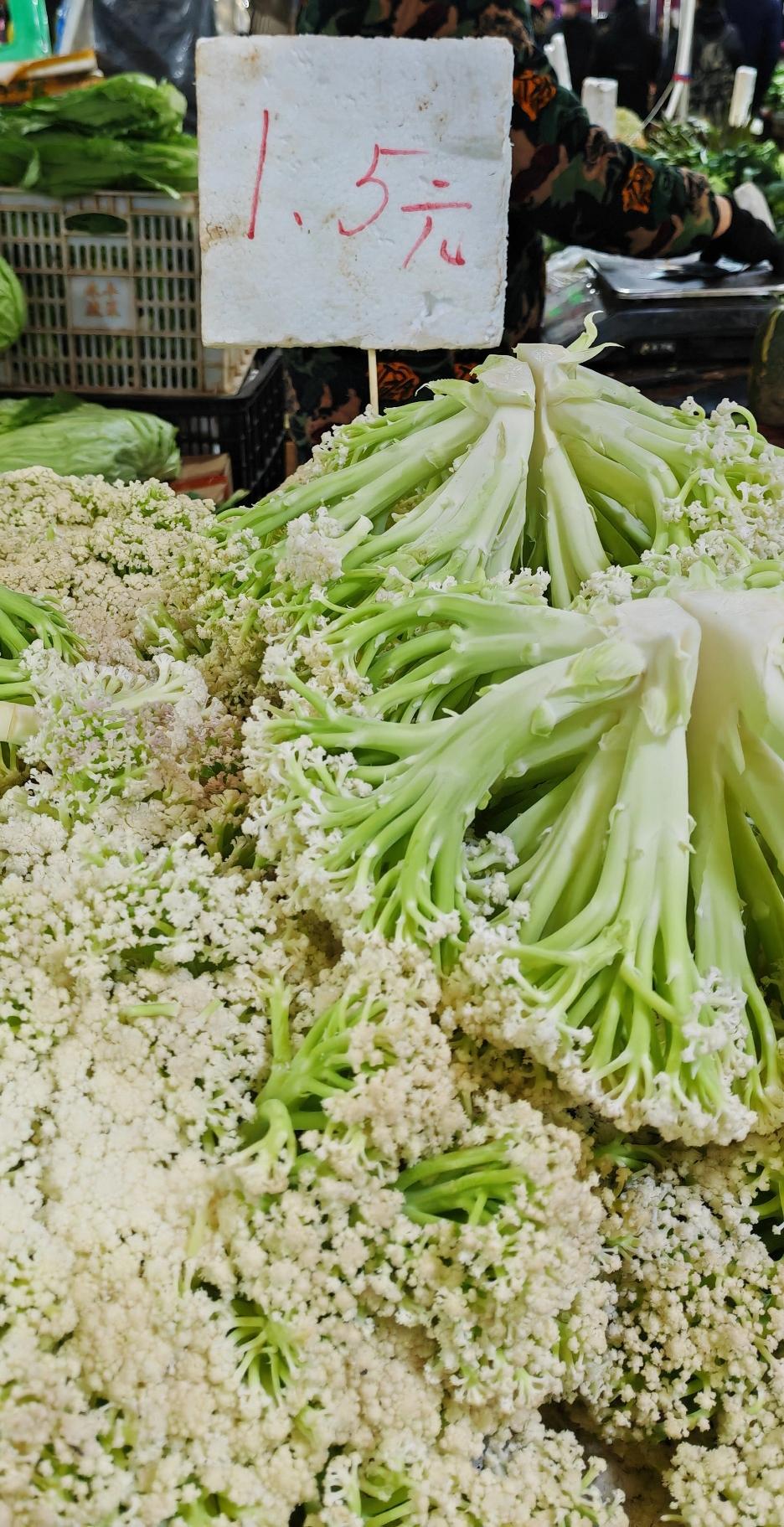 早上去农贸市场买菜发现菜价比前段时间便宜了不少,西红柿4.5元,豌豆尖2.5元,白萝卜1元一斤等等,本地菜大量上市了,把价格也打了下来,前段时间散花菜要卖6元钱一斤,今天才1.5元一斤,这种散花菜炒腊肉很好吃,今天也买了点。