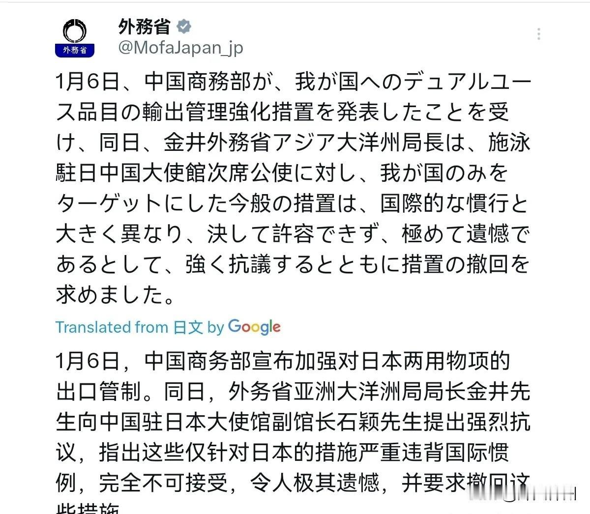 1月7日,日本外务省声称,1月6日,中国商务部宣布强化对日本两用物品的出口管制措施。同日,日本外务省亚洲大洋洲局局长金井向中国驻日大使馆公使衔参赞提出强烈抗议,称此次专门针对日本的管制措施与国际通行惯例严重不符,完全不可接受,对此深表遗憾,并要求中方撤回该措施。 评几句: 日方急着抗议的背后,其实藏着明显的逻辑漏洞。日本外务省就中方强化两用物品出口管制提出抗议,宣称此举“不符合国际惯例”,这番表态,其实经不起推敲。 中方出台相关管制措施,完全依据本国《出口管制法》,针对的是可能用于军事用途的物项和相关主体,既是维护国家安全的必要举措,也是履行防扩散国际义务的应有之义,于法有据、于理应当。此前日方公然发表涉台错误言论、暗示武力介入台海,还频繁将中企列入出口管制清单,中方的管制措施正是对这一系列错误行径的正当回应。 反观日方的抗议,似乎有意忽略了一个关键前提:出口管制是各国通行的做法,不少国家都在根据自身安全需要,不断完善相关监管体系。日方一味指责中方举措,却对自身频繁出台的贸易限制措施避而不谈,这种双重标准的做法,难免引发外界质疑。 日本在重稀土、镓等关键物资上对华依存度极高,重稀土更是近乎100%依赖中国供应,相关管制措施自然会对其产生一定影响。但说到底,经贸合作的基础是相互尊重,日方若继续坚持双重标准,最终只会让自身产业链承压——这难道是其想要的结果?