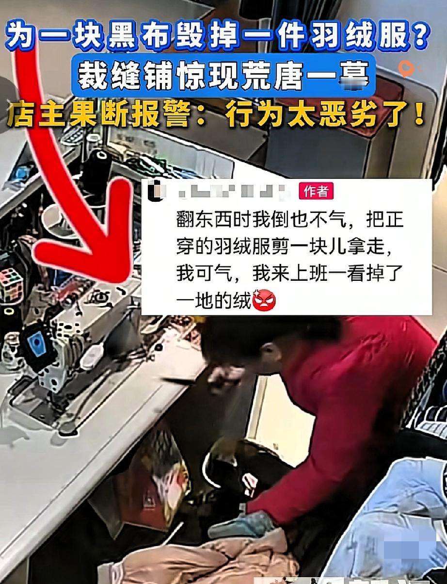 见过自私的,没见过这么明目张胆自私的! 河南漯河这位大妈的操作,真是把“利己主义”刻进了骨子里。 家里衣服破了要块黑布,去裁缝店翻找无果,居然趁店主不在,直接剪了人家穿的羽绒服凑数。 满地羽绒的背后,哪里是缺一块布,分明是缺了最基本的边界感和道德心。 别拿“年纪大”当借口,年纪从来不是侵犯他人权益的挡箭牌。 根据法律规定,故意损坏他人财物本就该担责,大妈这行为既不道德更涉嫌违法。 店主果断报警的做法太对了,对付这种毫无底线的自私,就该用规则教她做人。 真正的体面从不是占别人便宜,而是哪怕自己有需求,也不触碰别人的利益。 你们觉得大妈该怎么赔偿才合理?来评论区聊聊你的看法~