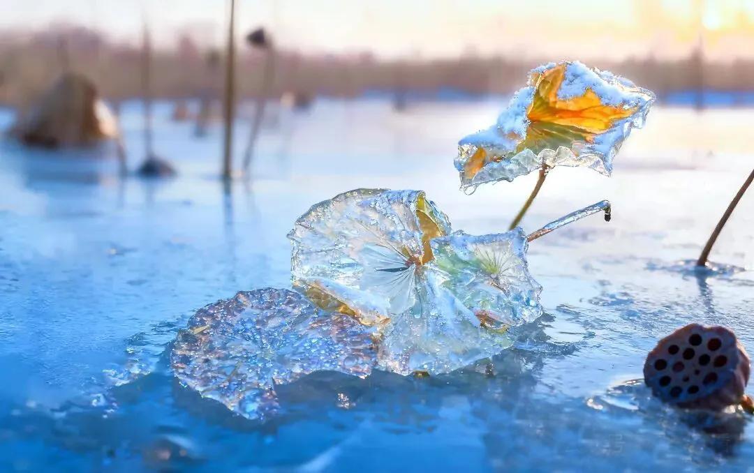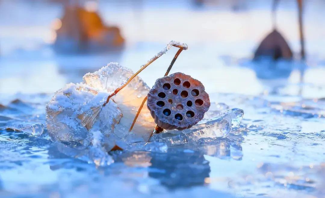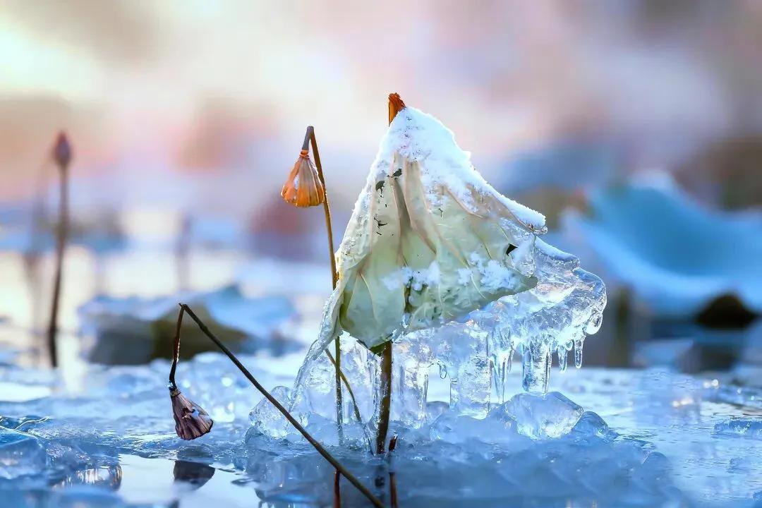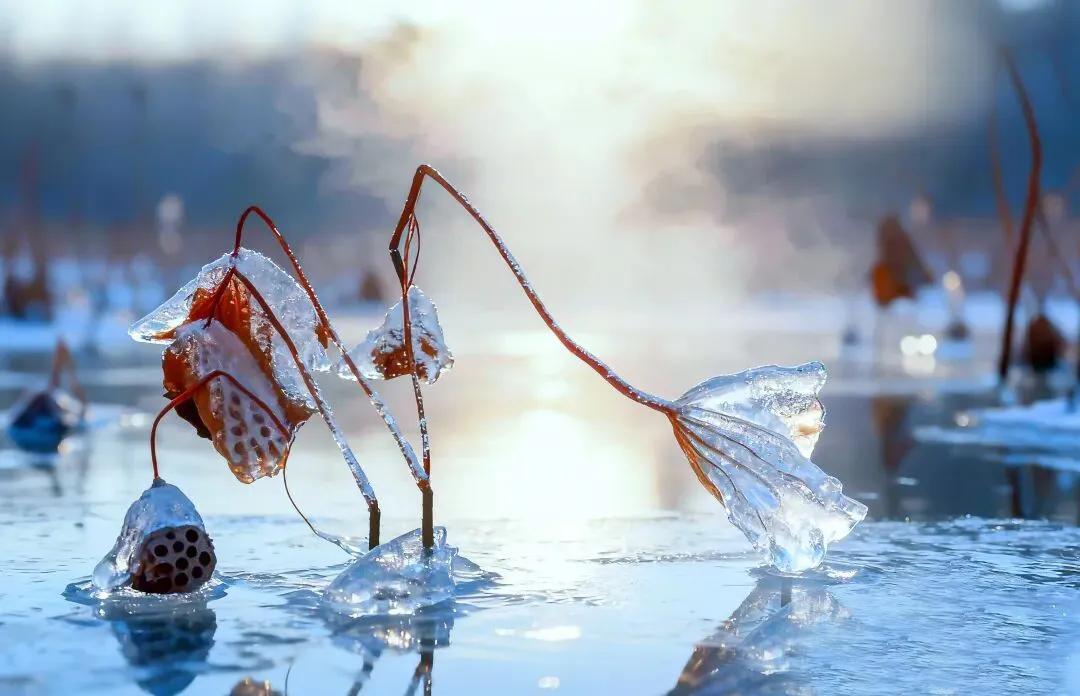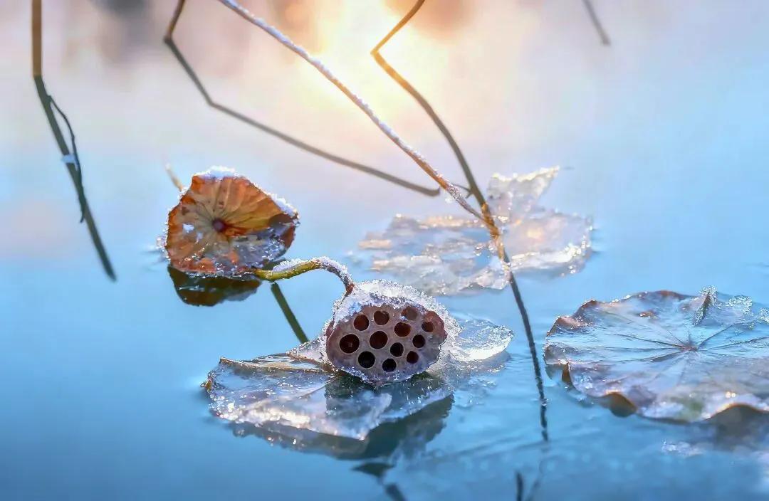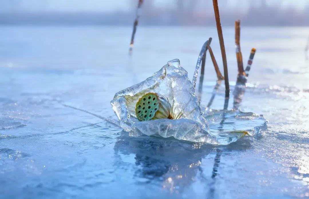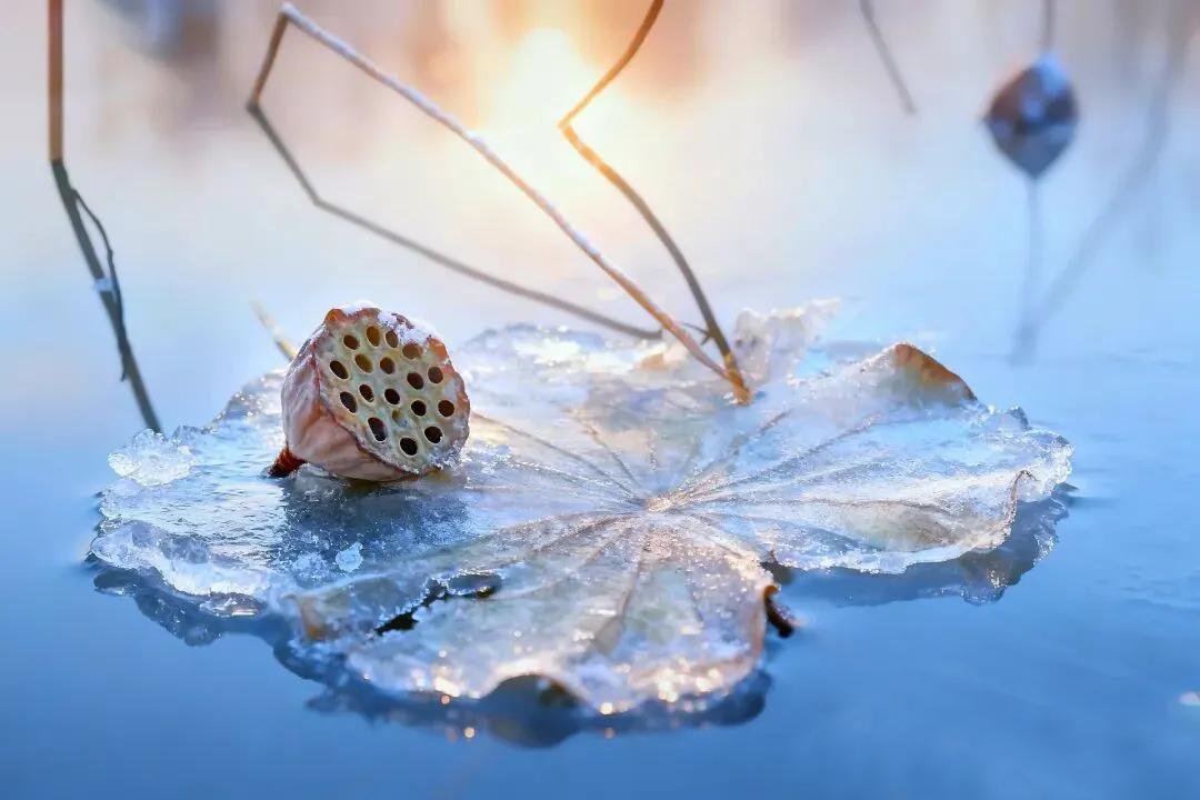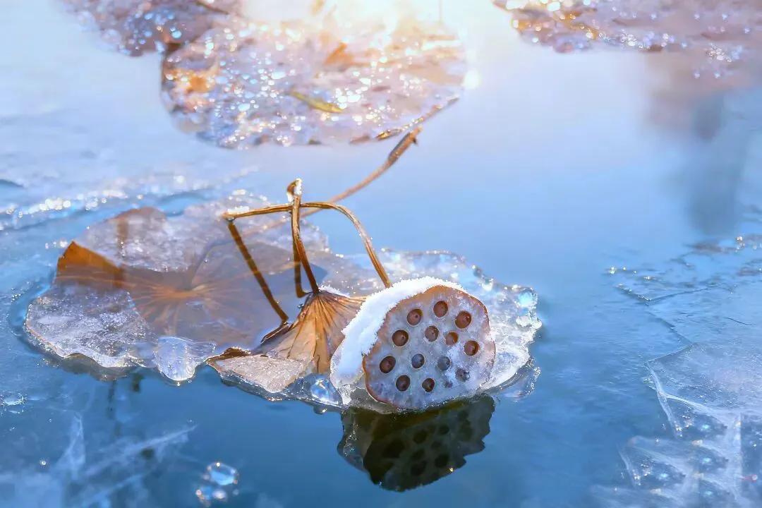 【素材|冰荷之美】 “池底枯荷瘦不胜,池冰新琢玉壶凝。”——宋·杨万里《池冰二首》 池底,枯荷的枝叶瘦骨嶙峋,仿佛诉说着岁月的沧桑。而池冰,则如玉壶般新琢,晶莹剔透,与枯荷形成了鲜明的对比,展现出一种清冷而坚韧的美。古诗词 美图 素材