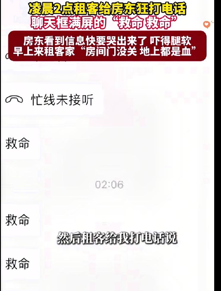 凌晨两点的救命语音+满楼道血迹,这事儿换谁遇上都得吓破胆! 广东这位房东早上醒来看到租客的求救信息和未接语音,心瞬间揪到嗓子眼,赶去租客住处的路上,看到满地血迹和敞着的房门,腿都软了,赶紧报警的同时,愧疚和后怕快把他压垮了。 好在虚惊一场! 租客是喝多了磕破头,当时身边没熟人只能求助房东,事后已经去医院包扎了。 这事儿真的给所有人提了个醒:手机勿扰模式真不能随便开整夜,尤其是身边有需要关照的人,或者像房东这种需要随时响应租客的角色,一个疏忽可能就是一辈子的遗憾。 房东最后带租客吃火锅压惊的做法超暖心,不过话说回来,你晚上会给手机开整夜勿扰吗? 评论区聊聊你的看法!