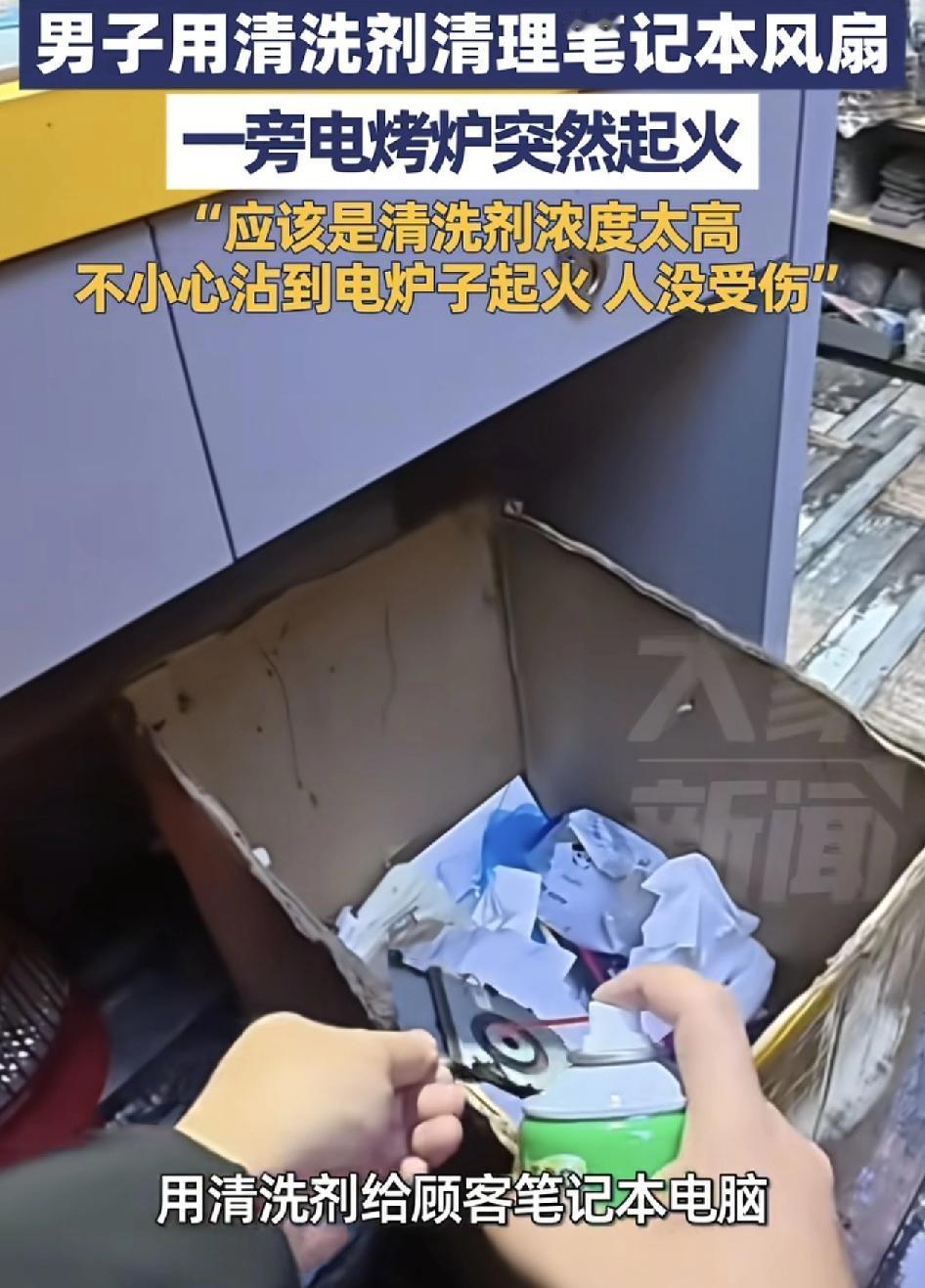湖北恩施一男子用清洁剂来清洗电脑上的灰尘时,没有注意脚刹的电路,电炉几分钟之内就起火了,幸亏人没有受伤。男子说应该是清洁剂的浓度过高导致起火的。冬天用电用火一定要注意安全,像这种易痒易包的液体,更加要远离火源。