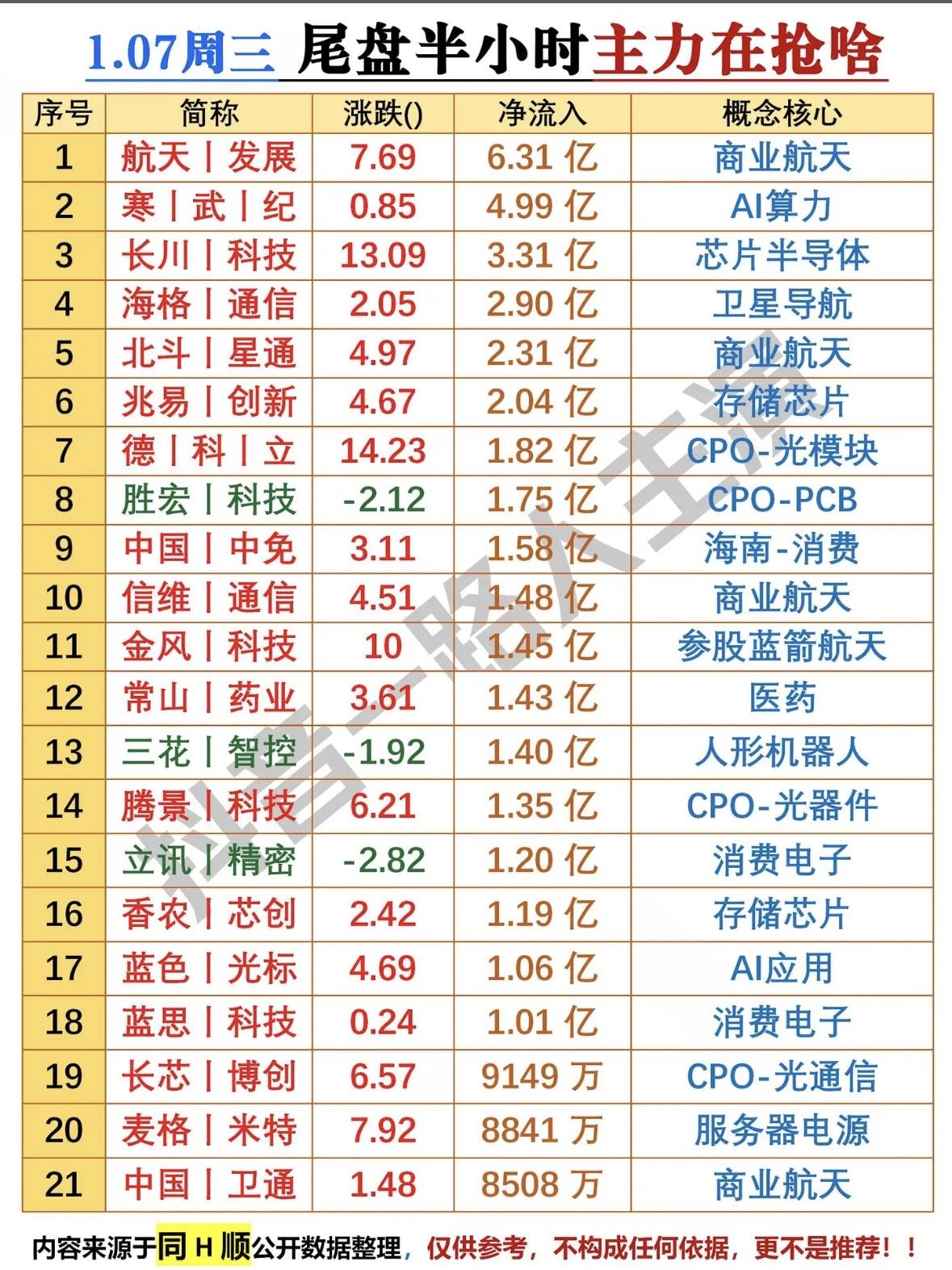 股市快讯 1.07周三尾盘半小时主力抢筹榜,揭秘哪些股票受追捧! 主力抢筹方向:商业航天、AI算力、芯片半导体、卫星导航、存储芯片、光模块、消费电子、人形机器人等科技赛道。