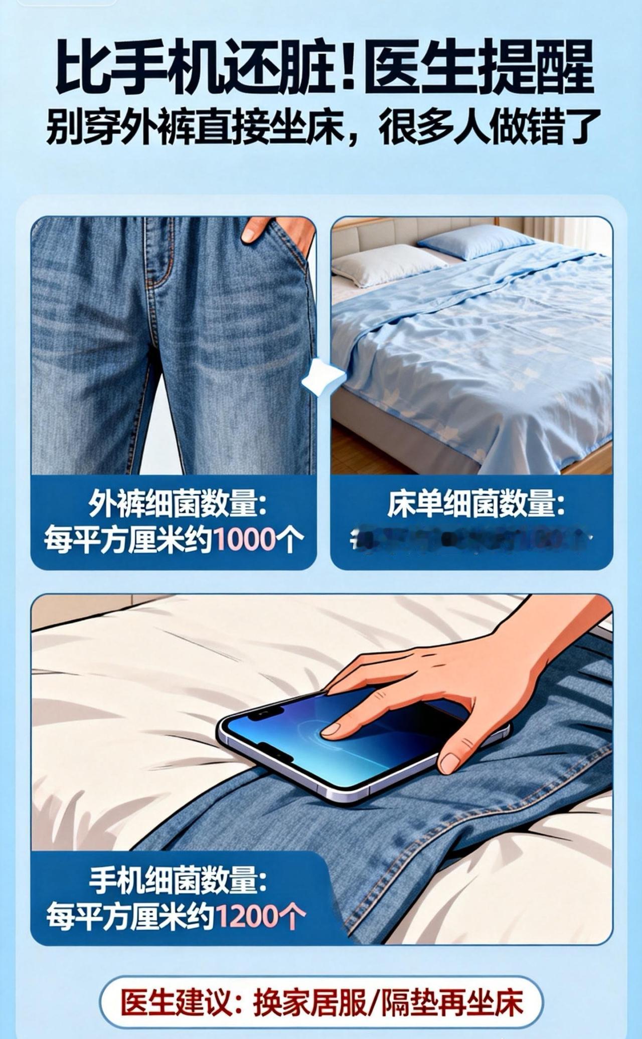 比手机还脏!医生提醒:别穿外裤直接坐床,很多人做错了 最近,“回家仪式感”成为社交平台热议话题。但你知道吗?真正的健康仪式感,可能从换掉外裤开始。医生提醒:穿着外裤直接坐在床上,可能把“看不见的健康隐患”带回家。 想象一下:地铁座位、公共座椅、室外台阶……这些外裤接触过的地方,附着着无数细菌、真菌和尘螨。研究显示,裤脚表面的污染物数量可能比手机、门把手更多。当我们穿着外裤坐在沙发或床上,这些微生物就会悄悄转移。 “尤其是家中有老人、孕妇、幼儿或皮肤敏感人群时,更需注意。”专家解释,这些污染物可能引发皮肤瘙痒、过敏,甚至增加感染风险。最近正值换季过敏高发期,这个提醒特别及时。 一个简单习惯就能解决:回家先换家居服。这是成本最低的“健康防护墙”,既能隔开外部污染物,又能帮助身心切换状态。 不妨试试“进门三件事”:换鞋、洗手、换家居服。这个小改变不仅能保护家人健康,还能营造舒适温馨的家庭氛围。毕竟,家应该是干净安全的港湾。 从今天起,给你的床和沙发多一层保护吧。健康生活,往往就藏在这些看似微小却至关重要的习惯里。