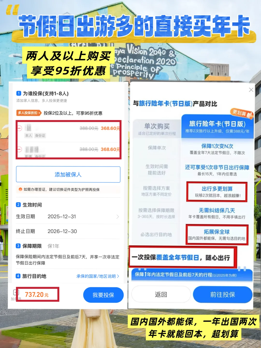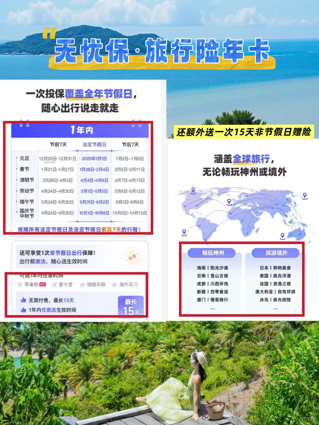 作为经常出去玩的旅游博主,我以前都是买短期旅行险,一次就得200+,今年刚好刷到年卡,看了下价格,一年只要388元,不限次数,而且它覆盖一年内法定节假日及前后7天的行程,还送15天非节假日赠险❗对我这种一年跑n个地方的人来说,真的超划算!