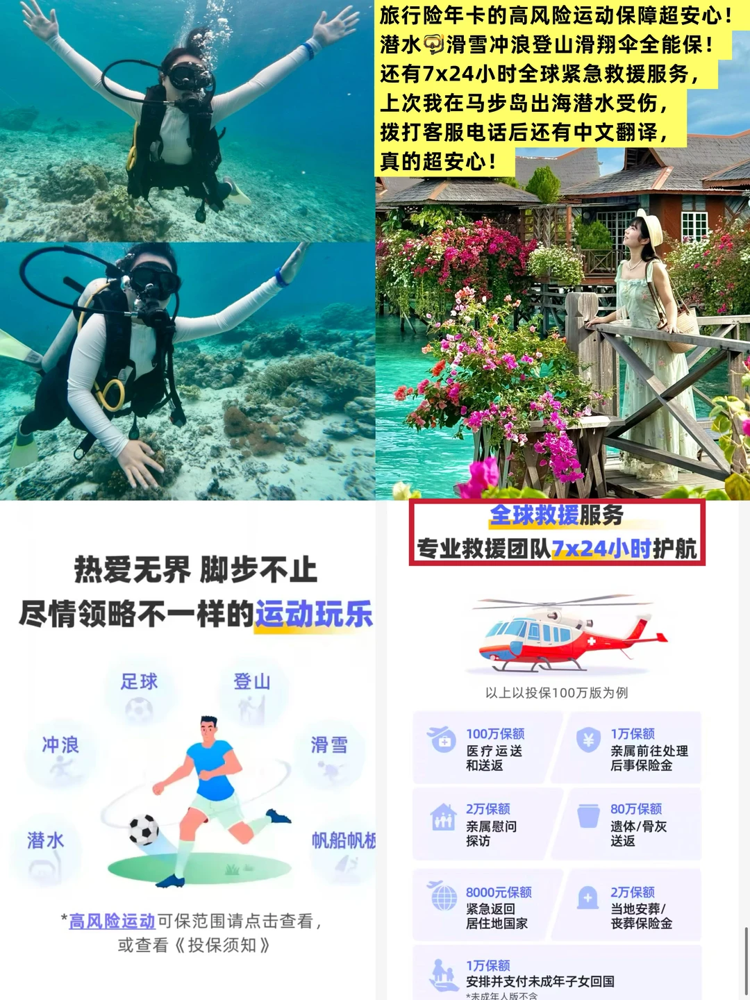 像出岛潜水🤿、滑雪、登山、滑翔伞这些户外运动,旅行险年卡高风险运动保障全能保!还有7x24小时全球紧急救援服务。 上次我在马步岛潜水受伤,上岸后打客服电话还有中文翻译,全程沟通无障碍,真的超贴心!
