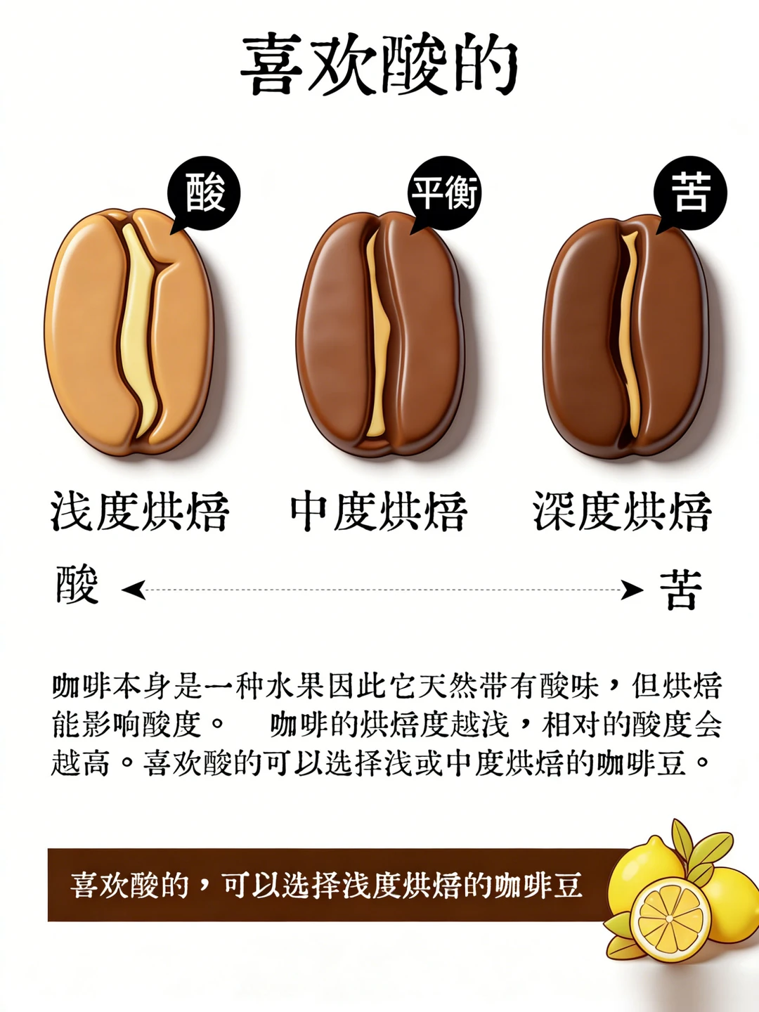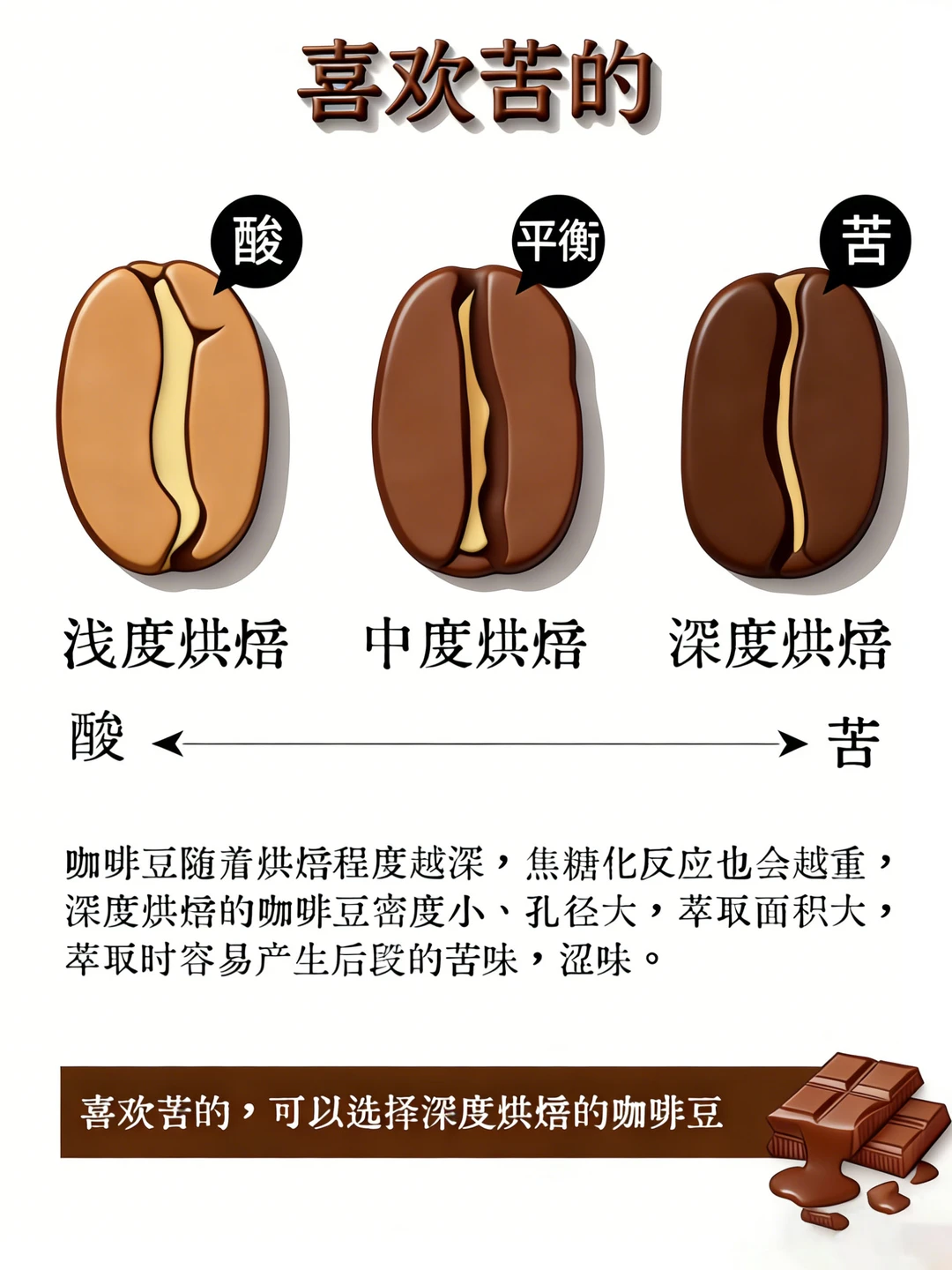 咖啡豆烘焙越深,苦味越重、酸味越淡: