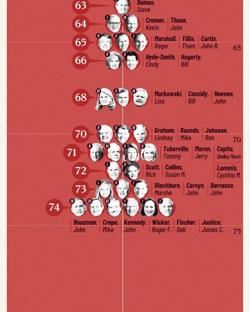 🔥 婴儿潮一代 是图中最密集的区域,年龄集中在 55 岁到 70 多岁之间。从 50 多岁一直延伸到接近 75 岁,这一代几乎构成了共和党参议员的“中坚骨架”。他们普遍拥有多年从政经验,在委员会、党内领导层以及政策制定中占据关键位置,是当前共和党立法与博弈的核心力量。