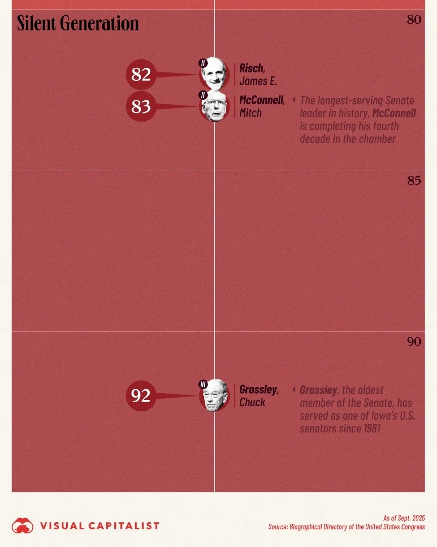 🕰️ 在更高龄区间,出现了 “沉默的一代” 成员。年龄超过 80 岁的参议员数量虽少,但象征意义极强。其中包括任职时间极长、在党内和国会历史上具有标志性地位的人物。例如年逾 80 岁仍在任的参议员,往往被视为制度连续性的象征,而不是政策创新的推动者。