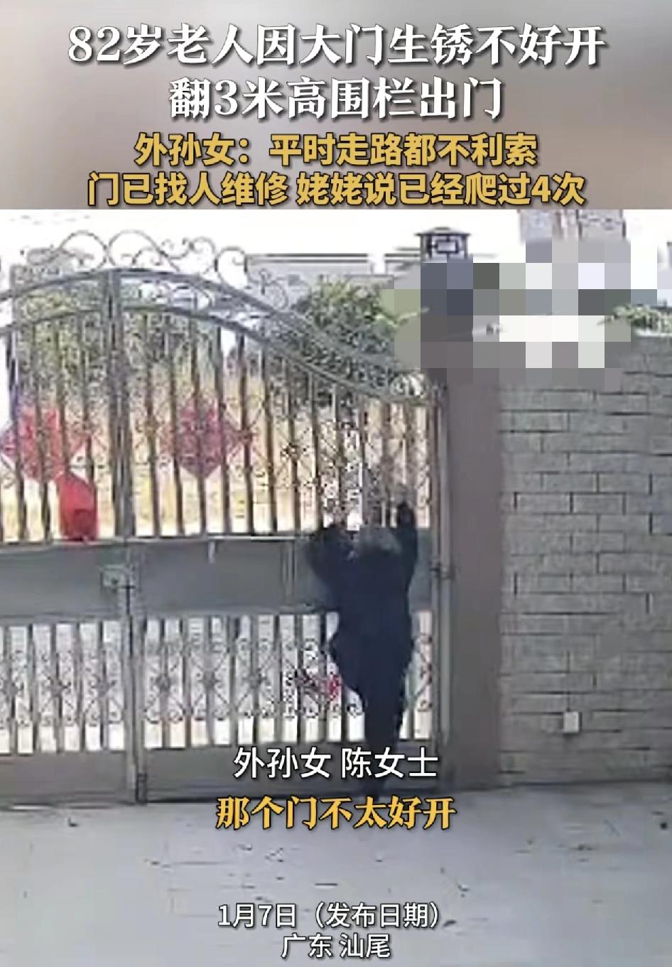 广东汕尾一位82岁的老奶奶徒手爬三米高的围栏出门,由于门锁生锈不好开。老奶奶居然想到这样的办法。其外甥女说,老奶奶平时走路都不利索了,没想到会选择这样的方式出门,他还说自己已经爬过4次了,现在已经找人过来维修门了,很多人说老奶奶是不是不想麻烦年轻人才不会跟家里人说门不好开的事情。