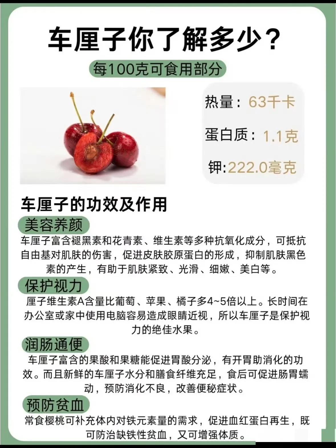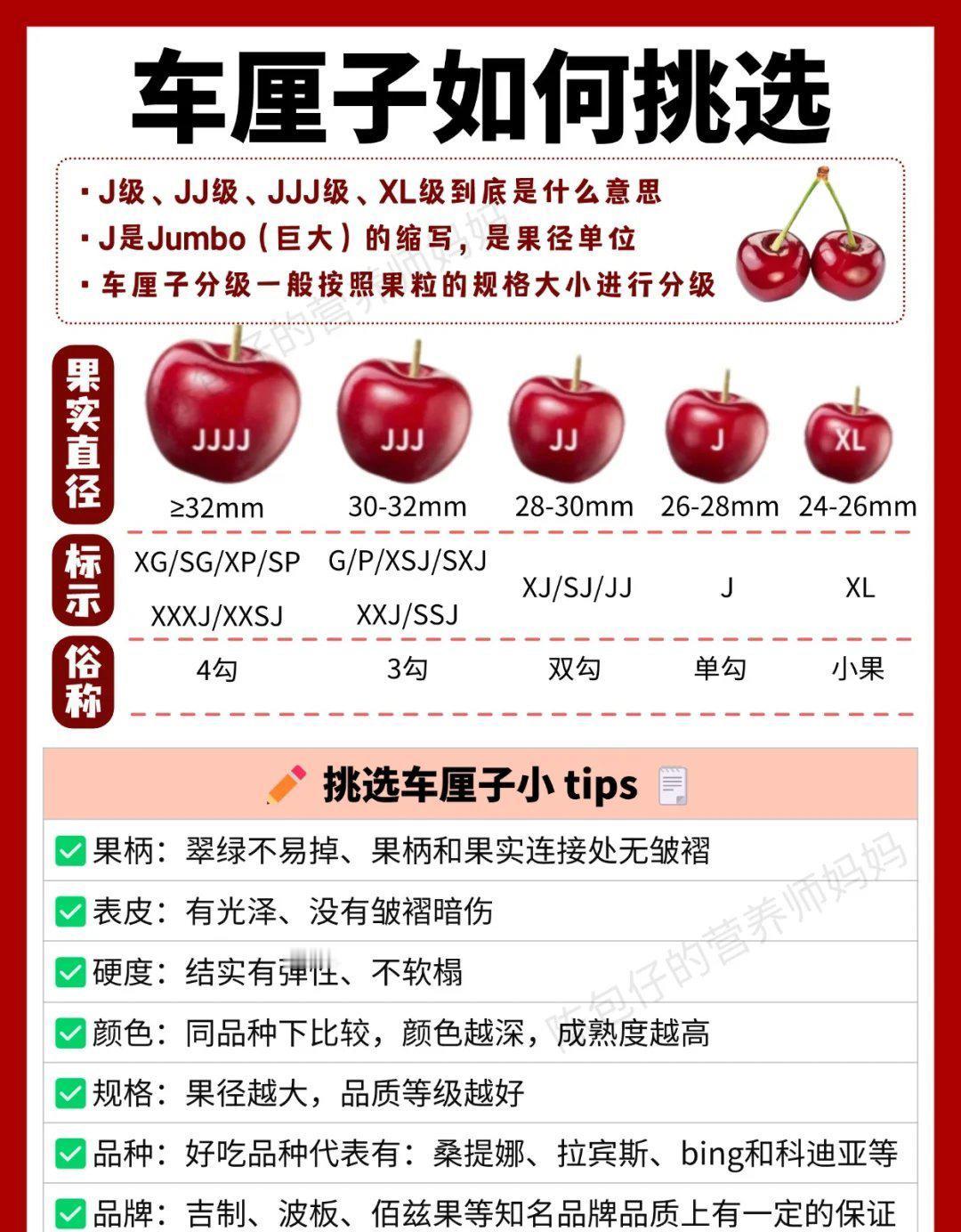 听我一句劝,买车厘子这么选: 1、大小分级:J越多,个头越大; 2、颜色分级:深浅决定甜度,黑车最甜; 3、产地分级:选智利准没错! 车厘子的大小分级以“J”的数量表示,这是国际通用的标准。常见分级包括: JJ:中等大小,适合喜欢适中口感的人群。 JJJ:较大个头,果肉更饱满,适合追求满足感的消费者。 JJJJ:最大规格,意味着单颗重量和体积显著增加,适合作为礼品或特殊场合选择。 选购建议:若偏好大果肉带来的丰富口感,优先选择JJJ或JJJJ;若注重性价比或日常食用,JJ即可满足需求。 颜色是判断车厘子成熟度和甜度的关键指标,销售中常用“红车”“黑车”等术语,外包装则标注字母: L(Light):颜色最浅,呈浅红色,甜度较低,酸味明显,适合喜欢酸甜平衡或制作果酱的人群。 R(Red):中等红色,口感脆爽,甜度适中,是酸甜口爱好者的理想选择,尤其适合搭配酸奶或沙拉。 D(Dark):颜色最深,接近黑色,甜度最高,酸味几乎不显,适合纯甜口味偏好者,直接食用或作为甜品点缀都很合适。 科学依据:颜色深浅与成熟度直接相关,深色车厘子积累了更多糖分,因此更甜。例如,D级车厘子通常在树上停留时间更长,糖分转化更充分。 不同品种的车厘子风味各异,主要分为: 宾(Bing):经典品种,果实大而甜,颜色从红到黑都有,适合广泛人群。 科迪亚(Kordia):果肉紧实,甜度高,酸度低,是纯甜爱好者的首选。 拉宾斯(Lapins):晚熟品种,脆甜多汁,颜色偏深,适合追求新鲜口感的人群。 桑提娜(Santina):早熟品种,酸甜适中,果皮薄,适合喜欢清爽风味的人群。 产地影响:智利、美国、澳大利亚等地的车厘子因气候差异,甜度和风味略有不同。例如,智利车厘子因昼夜温差大,糖分积累更显著。 包装信息:原箱车厘子外包装标注的字母(L/R/D)和品种名是重要参考,优先选择符合个人口味偏好的标注。 颜色:均匀深色(如D级)表明成熟度高,避免浅色或斑驳果实。 果梗:新鲜车厘子果梗翠绿且紧贴果实,干枯或脱落则可能存放过久。 硬度:轻轻按压,坚实有弹性说明新鲜,软烂则可能变质。 储存建议:购买后冷藏保存(0-4℃),保持干燥,避免潮湿导致霉变。 值得一提的是,选购车厘子的常见误区与注意事项: 误区1:颜色越深越好:虽然深色车厘子更甜,但个人口味差异大,纯甜爱好者选D级,而喜欢酸甜的选R级更合适。 误区2:大小决定品质:大小影响口感,但甜度主要由颜色和品种决定,例如小颗的桑提娜可能比大颗宾更甜。 注意事项:避免购买果皮破损或发霉的车厘子,如发现异味或软烂,应立即丢弃。