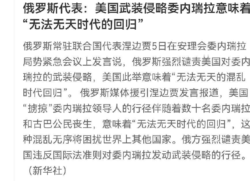 痛批!联合国关于美国侵略委内瑞拉的紧急会议结束了,看了一下俄罗斯代表的发言,那简直就是一个痛批美国,给予美帝国主义强烈谴责,一点面子也没给! 我专门截了个屏,大家可以看看下图俄罗斯代表的发言,划重点:一是该发言人说美国武装侵略委内瑞拉是“无法无天时代的回归”,二是国际社会不应允许美国自诩为“最高法官”。 这个发言为啥能戳中要害?因为他撕开了美国那层"民主卫士"的画皮,直接把事儿搁到了台面上——美国这次对委内瑞拉的军事行动,不是什么"反恐"也不是"人道干预",而是明晃晃的武装侵略。 您想想,派特种部队跨境抓人,顺带打死几十号委内瑞拉和古巴平民,完事还把总统马杜罗夫妇押到纽约受审,这操作像极了百年前殖民者拎着枪闯进别人家里抢东西的做派。 俄罗斯人最清楚这套路。涅边贾在会上提的"无法无天时代的回归",可不是随便扣帽子。翻翻历史书,上世纪美国在拉美搞的政变不下百次,智利阿连德、危地马拉阿本斯,哪个不是被美国中情局联合军阀搞下台? 但过去好歹还披层"反共"的外衣,这次倒好,连借口都懒得编了。直接说委内瑞拉"非法",自己带着北约军舰堵在人家海岸线上,这不就是"拳头大就是道理"的丛林法则吗? 更绝的是,美国司法部居然给马杜罗夫妇扣了个"贩毒"的罪名,可谁不知道委内瑞拉的石油储量全球第一?去年美国从委内瑞拉进口的原油突然暴增37%,这会儿说人家"非法",司马昭之心路人皆知。 再说"最高法官"这个比喻,简直入木三分。美国这些年在联合国的操作,像极了小孩玩游戏自己定规则——想打伊拉克就绕开安理会,说人家有"大规模杀伤性武器";制裁伊朗就单方面搞"次级制裁",威胁别国不许买伊朗石油。 这次更过分,直接把国际法院的管辖权当空气,自己在迈阿密开个法庭就审判别国总统。涅边贾在会上质问:要是每个国家都这么干,今天美国可以抓委内瑞拉总统,明天俄罗斯是不是也能去纽约抓特朗普? 这话听起来糙,却是实实在在的道理——国际法要是成了美国的橡皮泥,那联合国干脆改名"美国董事会"算了。 咱再往深了看,美国为啥非要盯着委内瑞拉?看看地图就明白,拉美被美国当成"后院",委内瑞拉的石油、哥伦比亚的矿产,都是美国资本眼里的肥肉。去年委内瑞拉刚和中国签了200亿美元的能源合作协议,美国立马坐不住了。 还记得2019年那次未遂的政变吗?美国扶持的瓜伊多拿着白宫给的剧本,结果上街游行就百来号人响应。 这次学乖了,直接动武,反正拉美国家敢怒不敢言——哥伦比亚、巴西这些邻居,嘴上谴责美国,身体却很诚实,允许美军借道部署。这就让人想起俄罗斯代表说的"新殖民主义":不用派兵驻扎,只要控制政权、垄断资源,照样躺着赚钱。 最值得琢磨的是俄罗斯的立场。为啥莫斯科这次跳出来当"出头鸟"?除了地缘政治的考量,更因为美国这套玩法已经威胁到所有非西方国家的底线。 想想看,要是今天能随便找个罪名抓委内瑞拉总统,明天是不是可以用"人权"理由抓普京?去年美国刚以"干预选举"为由制裁了322名俄罗斯官员,这会儿又在安理会玩双标——自己侵略别国叫"执法",别人自卫叫"破坏和平"。 涅边贾在会上提到的"数十名平民丧生",其实是在提醒全世界:今天委内瑞拉的血,明天可能就溅在莫斯科、北京或者德黑兰的街头。 还有个细节值得注意:这次安理会紧急会议,除了俄罗斯,哥伦比亚、南非、古巴这些国家也罕见地集体发声。哥伦比亚代表扎拉巴塔说这是"最恶劣干涉的回忆",南非代表帕斯摩尔直接点出"强权即公理"的危险。这说明啥?说明美国的霸道已经让传统盟友都看不下去了。 还记得2014年克里米亚事件吗?当时美国领着西方制裁俄罗斯,现在风水轮流转,轮到美国在拉美搞"克里米亚式"操作,结果自己成了孤家寡人。联合国投票时,除了英国象征性支持,其他13个成员国要么弃权要么反对,这种场面多少年没见过了? 说到底,俄罗斯代表的发言不是替委内瑞拉出头,而是在捍卫一个最朴素的道理:小国的主权不是大国的棋盘。美国总说"基于规则的国际秩序",可这个"规则"从来都是美国自己定的。 就像涅边贾说的,要是允许美国当"最高法官",那以后弱国的领导人睡觉都得睁只眼——不知道哪天美国特种部队就破窗而入了。 这种恐惧,委内瑞拉人正在经历,叙利亚、利比亚的老百姓早就经历过。俄罗斯这次站出来,不是为了斗气,而是明白一个道理:今天不拉住美国这匹脱缰的野马,明天全世界都得跟着遭殃。