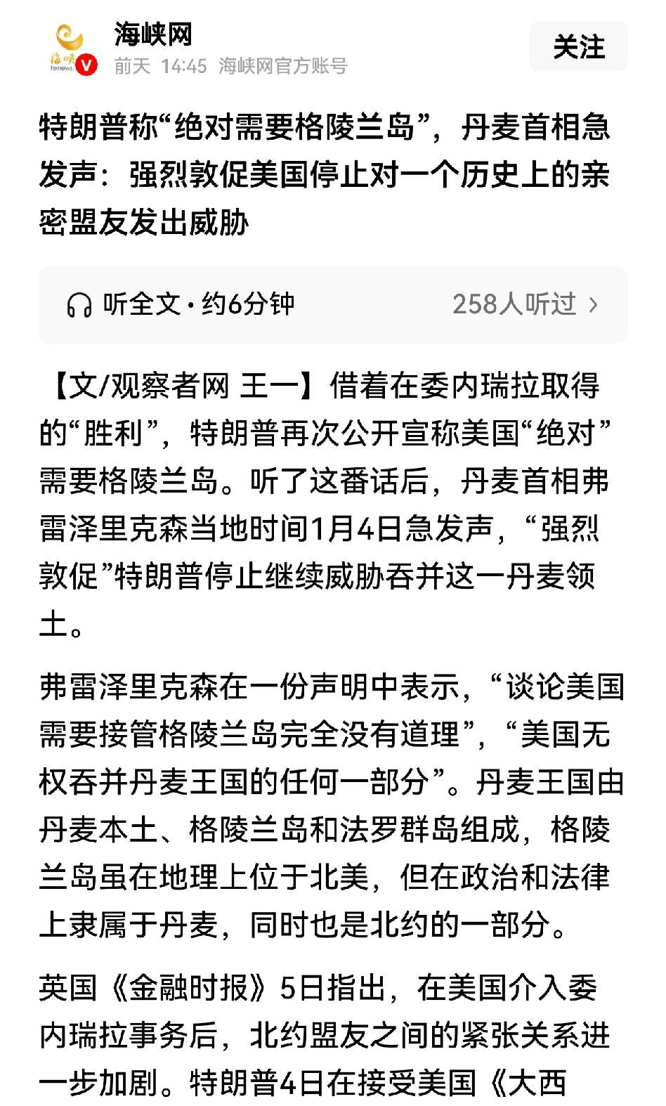 坚决支持欧洲人民、丹麦人民奋起抗击美国侵略,誓死保卫格陵兰岛。 图片源自网络。 美国占格陵兰岛 格陵兰岛现状 格陵兰地缘战略 格陵兰岛问题
