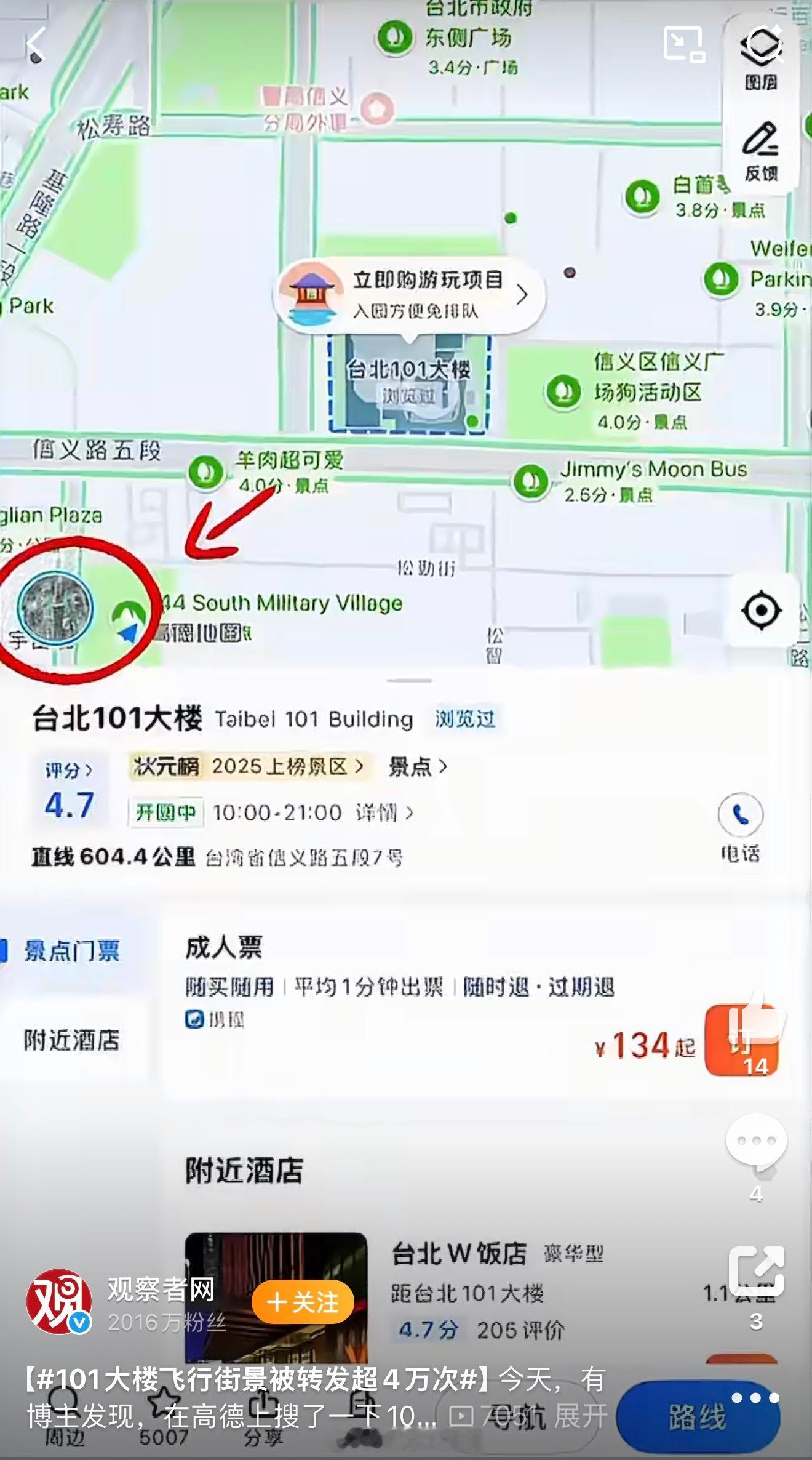 101大楼飞行街景被转发超4万次 能有这个热度很正常!上周101大楼相关画面刷屏后,大家果然都忍不住在云打卡~通过飞行街景就能从空中俯瞰这栋融合中华传统元素的地标,沉浸式体验超直观。101作为台北的城市名片,本身就自带话题感,加上黑科技加持,转发超4万、1.5万人标记想去一点不意外。科技让距离变近,足不出户就能“云逛”祖国的标志性建筑,这种连接感真的很戳人~