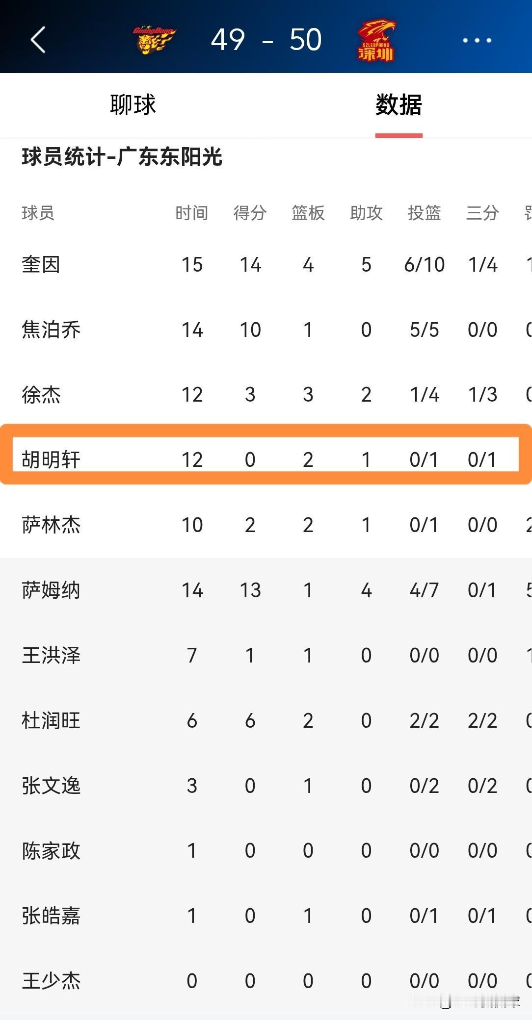 广东东阳光超级球星胡明轩真是太有自知之明了!在今天广东东阳光主场迎战深圳马可波罗的比赛中,目前双方的上半场比赛已经结束,广东东阳光暂时以49:50落后于对手。在前两节比赛中,胡明轩深知自己最近的投篮手感比较糟糕,因此他在首发出战的12分钟里仅仅出手了1次,没有得分,不过有2篮板1助攻,他的场上正负值为-10。 尽管今天胡明轩的状态依然非常低迷,但是我仍然要为他的自知自明点赞,希望他可以在下半场比赛中继续多传球少投篮。