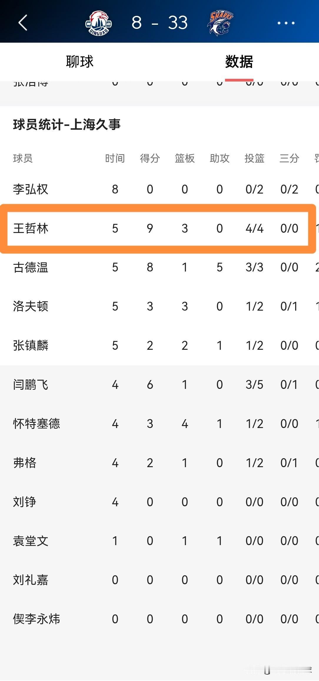 我必须要怒赞上海久事超级中锋王哲林!在今天上海久事客场挑战青岛崂山啤酒的比赛中,目前双方的第一节比赛已经结束,上海久事以33:8领先对手25分。在第一节比赛中,王哲林打出了极高的进攻效率,他在首发出战的5分钟里,投篮4中4,其中罚球1中1得到9分,还有3篮板1盖帽,他的场上正负值为+18。 本赛季的王哲林真是让人刮目相看,他在攻防两端都打出了非常不错的表现,希望有朝一日王哲林能够重回中国男篮国家队。
