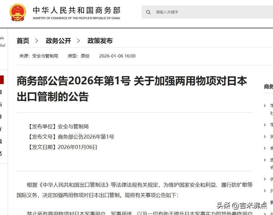 中国突然出手!稀土禁运背后,高市早苗真扛得住吗? 你没看错,2026年1月6日,中国商务部甩出一份公告——2026年第1号文件,《关于加强两用物项对日本出口管制的公告》。一句话概括:凡是能用在军事上的东西,特别是可能增强日本军力的材料,全都禁止出口。立刻生效。这可不是吓唬人,是动真格的。更狠的是,谁要是敢当中间商,把中国产的东西转手卖给日本军方,哪怕人在第三国,也得被追责。这个口子一开,全球企业和代理商都得掂量掂量,真要在中国市场和日本订单之间二选一。 说白了,这次的“两用物项”不是普通的工业品。镓、锗、锑、石墨、超硬材料……这些听着冷门,其实全是高精尖装备离不开的“工业维生素”。日本的相控阵雷达靠镓,导弹制导系统离不开稀土永磁,无人机导航系统得用锗,连电动车电机里的钕磁体,也得靠中国的重稀土。数据显示,日本在金属锗上对中国的依赖接近100%,镓超过85%,而像镝、铽这类中重稀土,野村综合研究所直接说了:电动汽车驱动电机几乎全靠中国供应。 你以为日本没想过脱钩?早想了。十几年前就开始全球找矿,澳大利亚、越南、印度到处跑,可问题是,就算挖出来矿石,还得运回中国来提纯。全球90%以上的稀土分离产能在中国,技术壁垒太高,短时间根本绕不开。这就尴尬了——矿可以不买你的,但加工你还得求我。再加上中国这回把“转口贸易”也封死了,新加坡、韩国这些地方想当中间人都不敢,谁也不想为了几单军火订单,把自己在中国的生意全赔进去。 高市早苗那边现在是什么反应?表面硬气,私下估计已经开始冒汗。她背后是右翼势力撑腰,越被施压,越得表现强硬,不然选票就不保。过去中国通过外交渠道警告,甚至特朗普当年都在电话里训过她,她也只能暂时收敛。可这次不一样,经济账开始算得清清楚楚了:如果稀土断供三个月,日本GDP直接掉0.43%,损失2.6万亿日元。这比中国游客不去日本旅游的影响还大。汽车工业一瘫,整个产业链都得抖三抖。 更微妙的是,中国日报透露,政府正在研究进一步收紧对日本的中重稀土出口审查,时间点是2025年4月4日列管的相关物项。这意味着,现在只是开始,接下来可能连民用领域都会被纳入管控范围。想想看,连特斯拉、宝马都曾因稀土供应紧张而停产,日本车企能扛几天? 所以你看,这不是简单的外交摩擦,而是一场精准打击。没有原材料,日本再强的制造技术也是空谈。巧妇难为无米之炊,再好的图纸,没有稀土和稀有金属,导弹飞不起来,雷达也睁不开眼。全球供应链的命门,有时候就卡在几样关键材料上。 现在的问题是,高市早苗到底接不接这个招?是低头服软,还是继续嘴硬到底?反正风已经吹起来了,接下来每一步,都牵动整个东亚的神经。