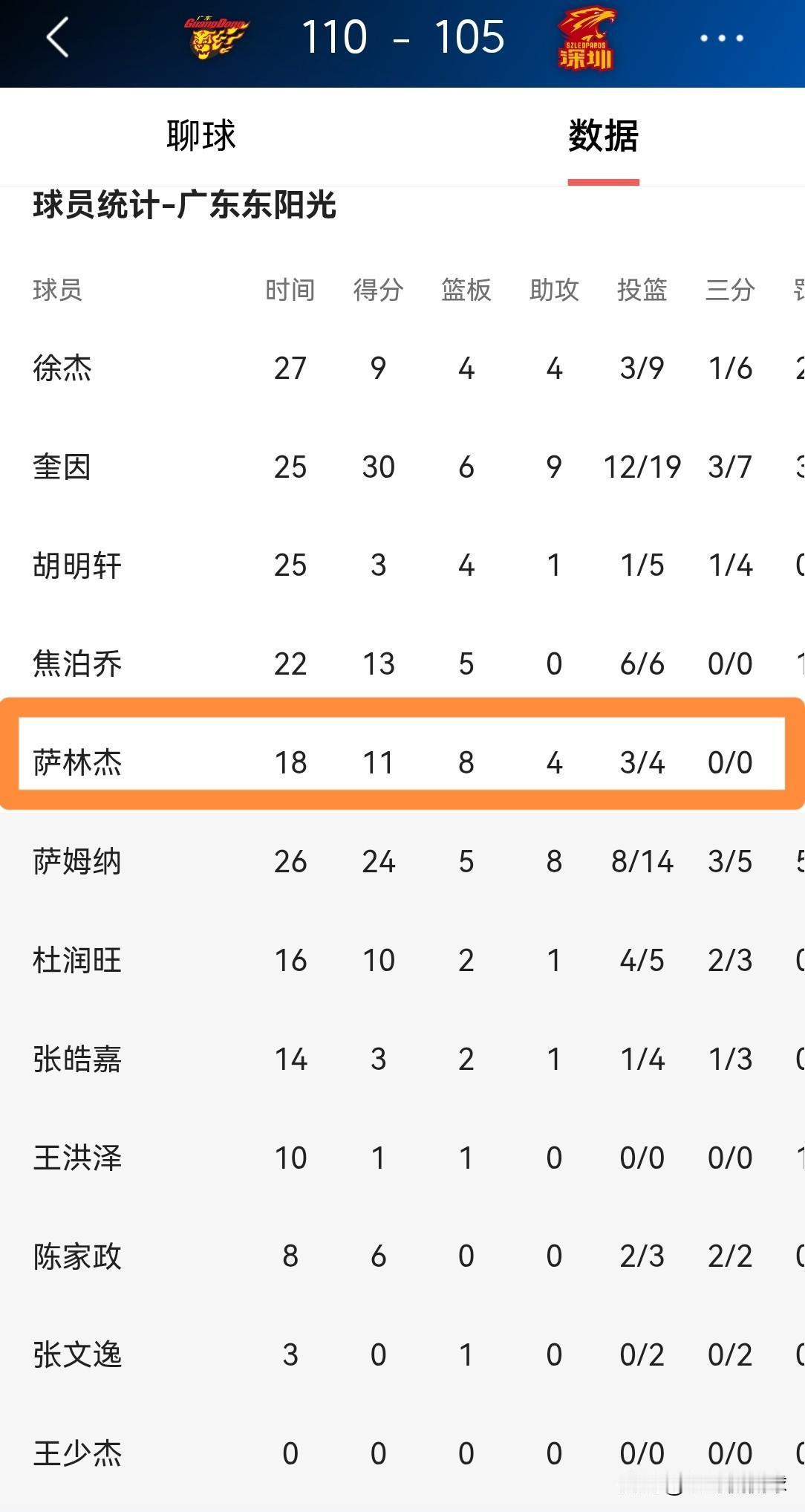 广东东阳光外援萨林杰真是球队的关键先生!在今天广东东阳光主场以110:105力克深圳马可波罗的比赛中,萨林杰首发出战18分钟,投篮4中3,其中罚球6中5得到11分8篮板4助攻1抢断。值得一提的是,在关键的第四节比赛中,萨林杰投篮3中3,其中罚球4中3得到9分,成为了球队能够赢球的大功臣。 在我看来,萨林杰堪称广东东阳光的关键先生,当球队需要他终结比赛的时候,他绝对不会手软。