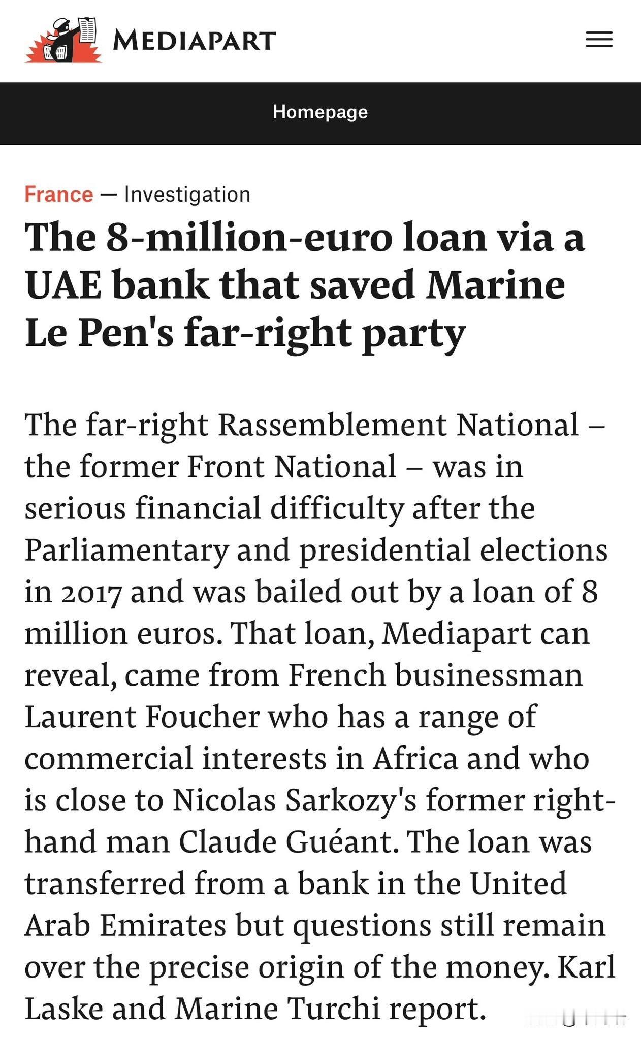 突发:阿联酋实际上已经向伊斯兰教宣战。 调查显示, € 800万英镑被输送给了玛丽娜·勒庞的极右翼政党国民联盟(前身为国民阵线),该党总部位于法国,公开敌视伊斯兰教和穆斯林。 据 Mediapart 的调查显示,这笔资金是通过一家位于阿布扎比的阿联酋金融机构转移的,这使得该党在 2017 年法国总统和议会选举后免于破产,并使其能够核实竞选账户并获得国家补偿。 这个政党的目标包括: ❌禁止在学校穿罩袍 ❌禁止在公共场所佩戴头巾 ❌停止清真寺的宣礼和限制祈祷 ❌提起诉讼关闭清真寺 ❌阻止穆斯林移民进入欧洲 有人把钱给了那个将穆斯林身份定为犯罪、在各个层面与伊斯兰教作对的政党。
