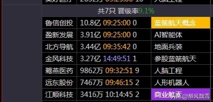 连板看市场主线一一1月8日 仅仅连板梯队角度来看,商业航天还是市场主线,连续3天净流出,昨天4家降温、多家老龙监管期,但要注意风险管理! 连板天梯以胜通能源14板居首,跨年龙:锋龙股份9板,都是独苗,没有板块效应! 雷科防务6板(商业航天核心)为高标,3-2板梯队分布岩山科技、金风科技等商业航天标的。商业航天成市场主线,梯队完整但后排分化明显。封板率降至65%,叠加高位监管趋严,资金从高位伪概念流出,转向低位补涨及业绩配套标的,博弈结构趋于优化。 人脑工程:分化顶一字,自娱自乐去吧! 次主线:机器人、军工、新能源车等,没有梯队,很难做! 还是玩商业航天,但要规避风险!