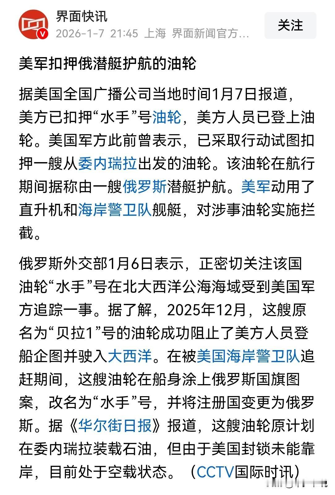 重演古巴危机,潜艇护航的俄罗斯油轮被美国截停 俄罗斯籍油轮“水手号”在大西洋被美国海岸警卫队截停,而“水手号”在两周之前还叫“贝拉1”号,因在委内瑞拉水域被美国海岸警卫队从加勒比海一直追逐到大西洋。 而此前央视新闻报道,俄罗斯潜艇已开始对“水手号”进行护航,然而在俄罗斯潜艇护航的前提下还被美国海岸警卫队截停并登船检查,看来美俄之间的危机要重演了,这次的危机可能要大于古巴导弹危机。