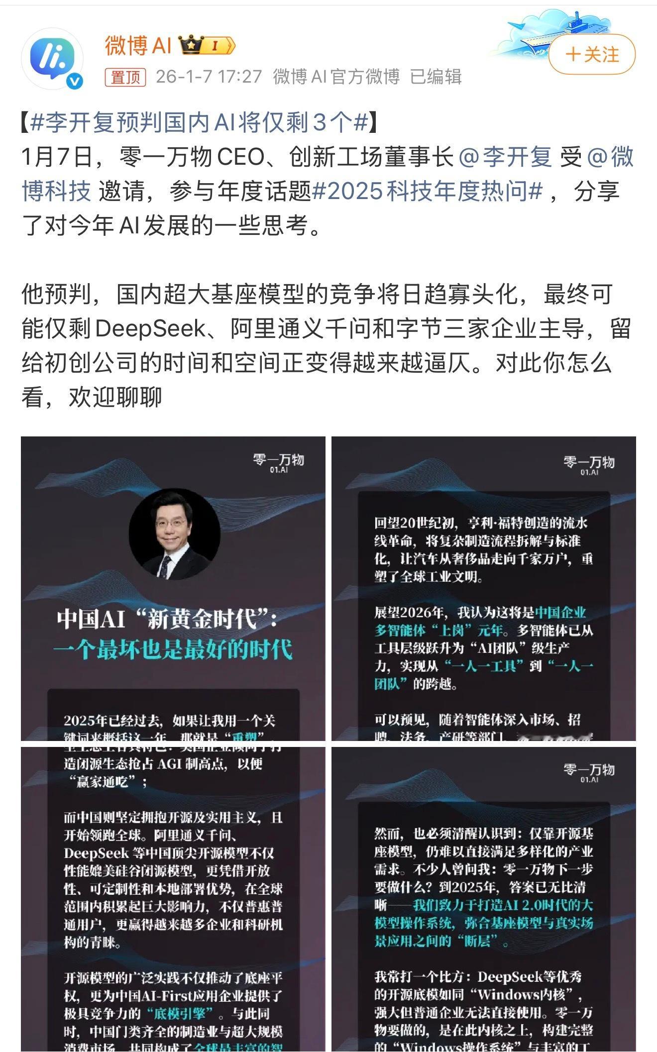 李开复预判国内AI将仅剩3个李开复认为国内超大基座模型市场,最终可能只剩下三家主导,DeepSeek、阿里通义千问和字节。这话一出,确实让不少人开始琢磨。现在各家都在拼命卷参数、拼算力,但市场终究有个天花板。资源越来越向头部集中,中小玩家面临的不仅是技术门槛,更是持续烧钱的生存考验。李开复这个“三强”猜想,大概也是看到了这种赢家通吃的趋势。不过,AI赛道变化太快,技术突破有时就在一夜之间。现在说格局已定或许还早,没准明年又有黑马冲出来。但可以肯定的是,能笑到最后的,一定是那些技术扎实、场景落地稳、并且真能创造价值的企业。