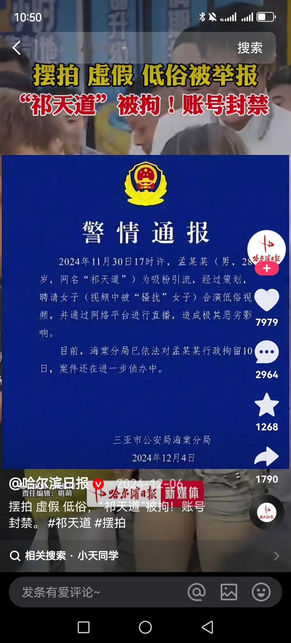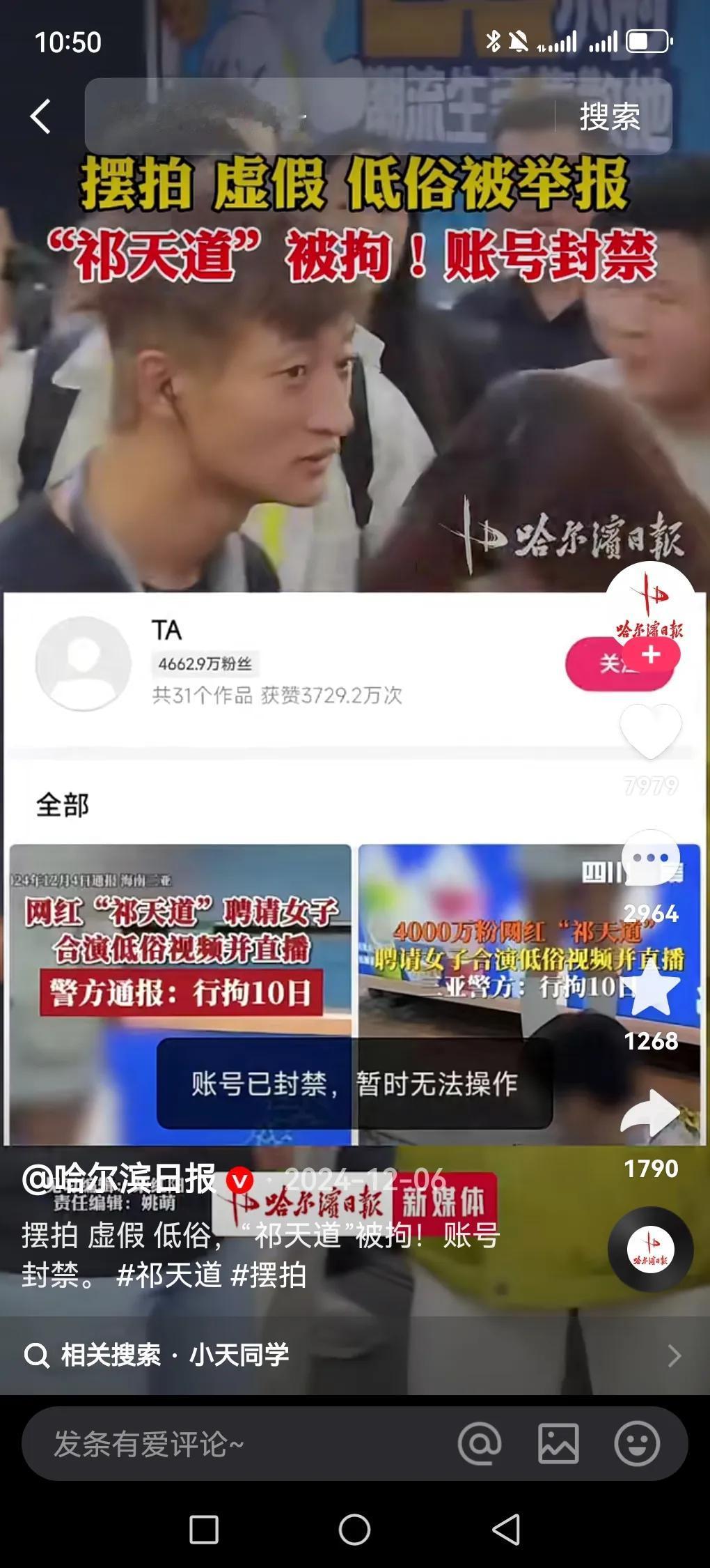 网红祁天道账号被封,原因一点不冤。12月4日警方通报,他为吸粉引流,策划并聘请女子合演低俗视频直播,影响极其恶劣,被行政拘留10日,次日账号就被封禁。 其实他恶行早有前科,2019年因虚假招聘诈骗700万被判4年,2022年回归直播自曝月入400万。直播里恶俗行为不断,让女嘉宾睡大腿、舔舌头、舔脚等,各种辣眼睛画面层出不穷,靠着这些吸引了4600多万粉丝。以前只是短期封号,这次公然违法,被封也是迟早的事,真是“多行不义必自毙”。