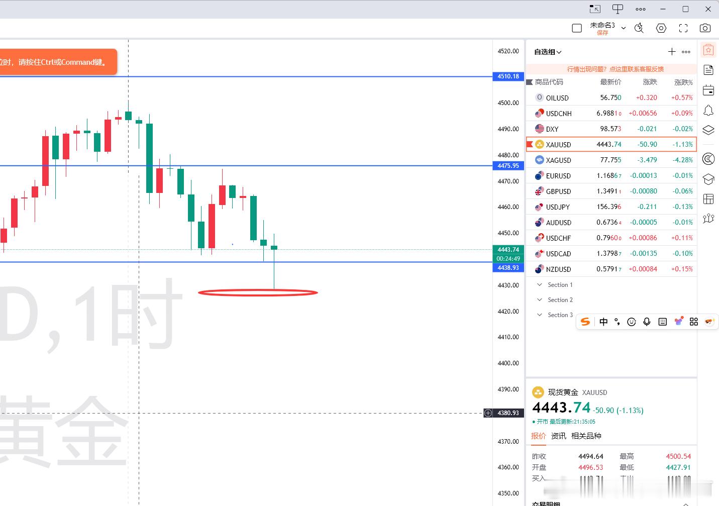 下的快上的也快这种行情就没有什么意思了!给到的4439空,提示在4428减仓后续拉上来触及保本损!不过也有着110点收获在,也还算可以!今天的行情总结一下就是磨性子!金价黄金