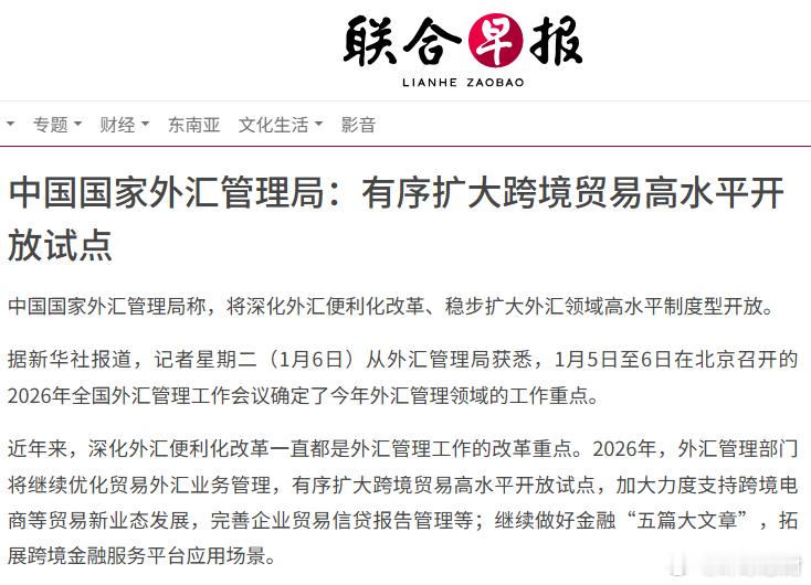 贸易跨境贸易 【外汇局划定2026年工作重点,有序扩大跨境贸易高水平开放试点】据联合早报消息,2026年全国外汇管理工作会议近日召开。会议深入剖析了当前国内外经济金融形势,并对2026年外汇管理工作作出了全面部署。会议明确,今年外汇管理工作将坚持稳中求进的总基调,重点深化外汇便利化改革,稳步扩大外汇领域高水平制度型开放,有序扩大跨境贸易高水平开放试点,以高水平开放促进高质量发展。近年来,深化外汇便利化改革始终是外汇管理工作的核心议题。2026年,外汇管理部门将持续发力,进一步优化贸易外汇业务管理。会议提出,将有序扩大跨境贸易高水平开放试点范围,并加大力度支持跨境电商、海外仓等贸易新业态的健康发展,同时完善企业贸易信贷报告管理制度。此外,会议强调要继续做好金融“五篇大文章”,不断拓展跨境金融服务平台的应用场景,通过科技手段提升服务效率。为帮助实体企业更好地应对汇率波动风险,国家外汇管理局将进一步完善企业汇率风险管理服务。会议指出,要支持金融机构开发设计更加简单、好用的汇率避险产品,切实降低中小微企业的汇率避险成本,并着力提升外汇市场基础设施的服务水平,为企业经营保驾护航。在银行端,作为重点改革内容的银行外汇展业改革将继续深入推进。该项改革自2024年12月推出以来,通过银行外汇业务流程再造,让实体企业切实享受跨境贸易和投融资便利化的政策红利。数据显示,截至2025年底,参与此项改革的银行已达到30家,覆盖范围逐步扩展至全国。2026年,外汇局将指导已改革银行向全国范围的分支行扩围,稳步推动更多银行启动改革,推动展业改革与便利化政策深度融合,为企业提供外汇业务集成式便利服务。在资金管理与区域建设方面,国家外汇管理局明确了多项新政策。会议提出,2026年将出台境外放款、国内外汇贷款资金管理等政策,并在全国范围内实施跨国公司本外币跨境资金集中运营管理政策,提升跨国公司资金使用效率。同时,加强自贸试验区外汇政策集成式改革创新,重点支持上海、香港国际金融中心建设,并加大对海南自贸港、粤港澳大湾区建设的支持力度。会议最后强调,要坚持底线思维,筑牢外汇市场“防波堤”“防浪堤”。外汇管理部门将进一步巩固和强化外汇监管,提升开放监管能力和水平,在推进开放的同时防范风险,全力维护外汇储备资产的安全、流动和保值增值。外汇领域分析人士指出,2026年全国外汇管理工作会议传递出“稳增长”与“防风险”并重的政策信号。一方面,有序扩大跨境贸易高水平开放试点、深化便利化改革以及支持跨境电商新业态,表明监管部门致力于通过高水平开放服务于实体经济,特别是针对中小微企业的汇率避险支持将有效降低企业经营成本;另一方面,强化银行展业改革和坚守监管底线,则体现了在复杂国际形势下,外汇管理部门对于维护国家经济金融安全的高度重视。这种“放管结合”的政策思路,将有助于在保持外汇市场稳定的同时,为中国外贸的高质量发展注入新动能。(环球网财经 文馨)我国情绪消费市场规模超2万亿元我国情绪消费市场强势崛起