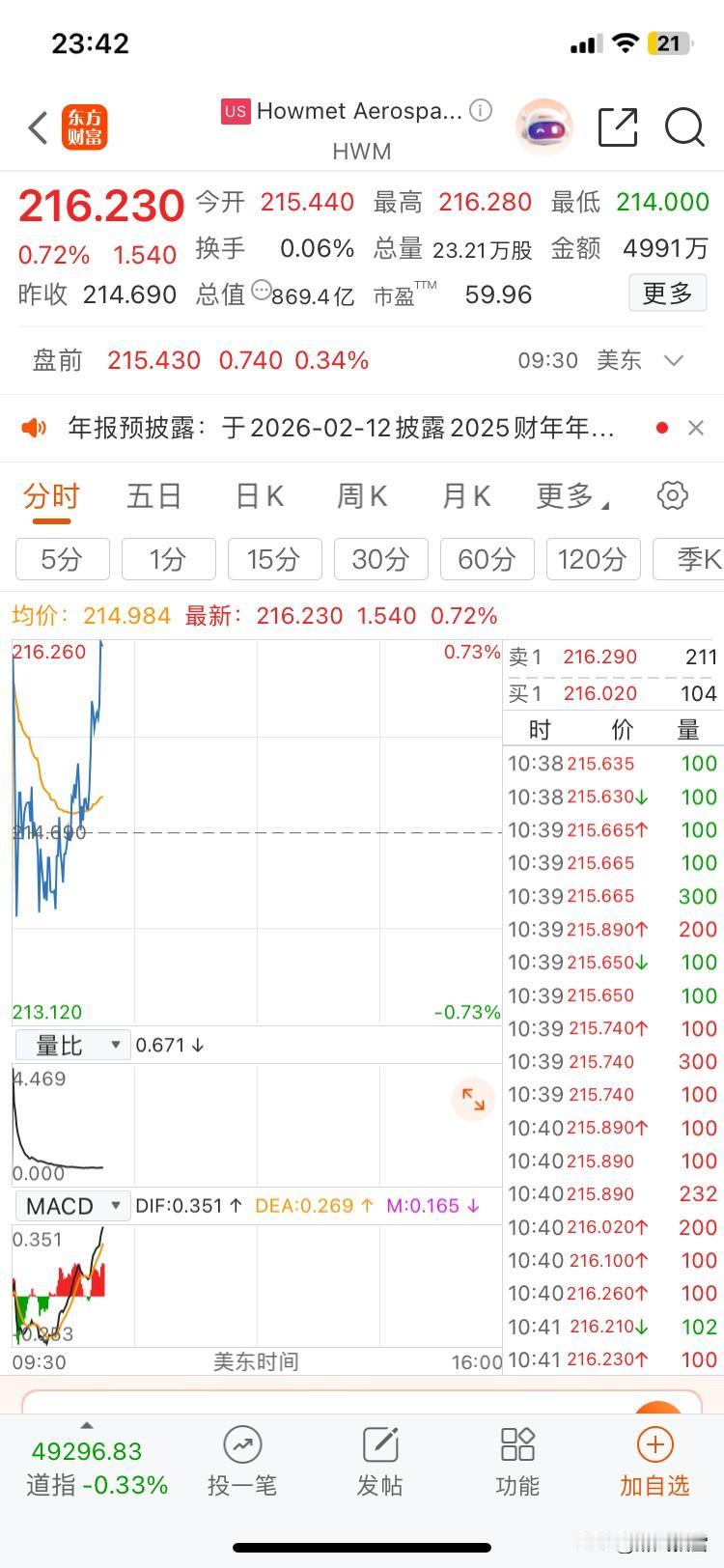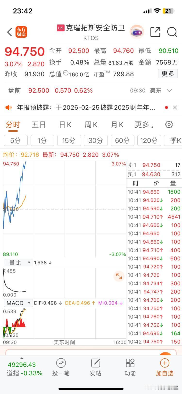 美市已开盘,涨跌互现 北京时间1月7日23:40分数据 美股三大指数走势分化,道指跌0.43%,纳指微涨0.18%,标普500微跌0.05%。中概股表现疲软,纳斯达克中国金龙指数跌1.36%。美股商业航天板块低开高走,从日内低点1883.34回升至1916.76,量比1.743,资金关注度较高。 明天大A调整概率加大!