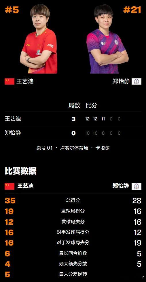 2026WTT多哈冠军赛:王艺迪3-0力克郑怡静,国乒迎新年开门红 北京时间1月7日晚,2026年乒乓球WTT多哈冠军赛展开首轮争夺。国乒世界冠军王艺迪登场,对阵中国台北名将、前世界杯女单亚军郑怡静,最终经过三局激战,王艺迪以3-0完胜对手,成功晋级女单16强,为中国乒乓球队赢得新年赛事的开门红。一、赛前看点:实力与交手记录均占优- 王艺迪:1997年出生,目前世界排名第5,长期稳居国乒主力阵容,手握混团、女团、女双三项世界冠军头衔,整体实力与大赛经验兼具。- 郑怡静:1992年出生,曾跻身世界前十,斩获过世界杯女单亚军、季军及奥运会混双铜牌,但近期状态下滑,当前单打世界排名已跌至第21位。- 交手历史:此前两人共7次交锋,王艺迪保持全胜战绩,且最近一次对决中曾以3-0轻松取胜,赛前普遍看好王艺迪晋级。二、比赛过程:三局激战皆逆转,王艺迪顶住压力1. 首局:12-10惊险拔得头筹首局双方展开高质量对攻,郑怡静凭借强势正手一度紧咬比分,先后追至3-3、7-7平。关键时刻郑怡静曾以9-7反超,但王艺迪迅速调整节奏,连得3分拿到局点,最终以12-10涉险拿下首局。2. 第二局:12-10再胜扩大优势第二局王艺迪开局领先,却被郑怡静反超至5-2、8-3。面对被动局面,王艺迪连追3分迫使对手请求暂停;暂停后王艺迪延续攻势,再拿3分以9-8反超,尽管后续错失1个局点,但最终仍以12-10再下一城,距离胜利仅差一局。3. 第三局:11-8锁定胜局背水一战的郑怡静开局以3-1领先,王艺迪迅速反击,连得4分实现反超,并持续遏制对手抢攻,将比分拉开至10-6,拿到4个赛点。虽被郑怡静追回2分,但王艺迪通过暂停稳定状态,随后再得1分,以11-8胜出,一局不失锁定晋级资格。三、赛事进展:女单16强已确定4席,蒯曼即将登场截至目前,WTT多哈冠军赛女单16强已产生4位选手,具体晋级情况如下:- 韩国选手金娜英3-2战胜新加坡的曾尖;- 日本选手早田希娜3-1击败摩纳哥的杨晓馨;- 日本选手张本美和3-0轻取韩国的申裕斌;- 中国选手王艺迪3-0战胜中国台北的郑怡静。接下来,国乒另一位选手蒯曼将在首日下半场赛事中亮相,对阵罗马尼亚世界亚军萨马拉,期待其能延续国乒的良好势头,顺利晋级。